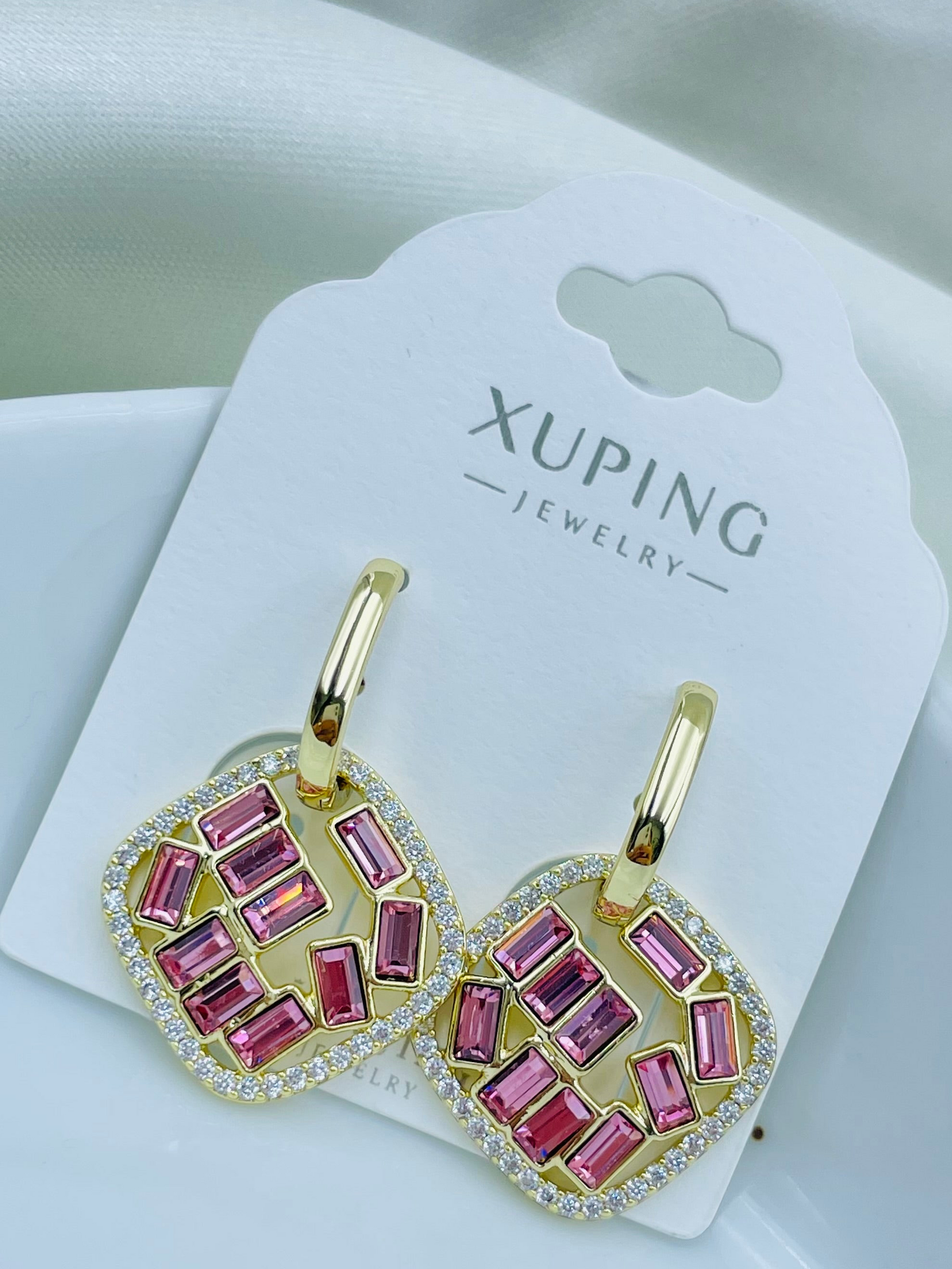 El colgante Arete Xuping Jingjing es una pieza de alta calidad, elaborada en dorado y diseñada con un elegante cuadrado lleno de pequeños cristales Swarovski rosados. A través de su hermoso y original diseño, esta joya te permitirá agregar un toque de elegancia y sofisticación a cualquier atuendo. ¡Haz que tus prendas destaquen con este increíble accesorio!