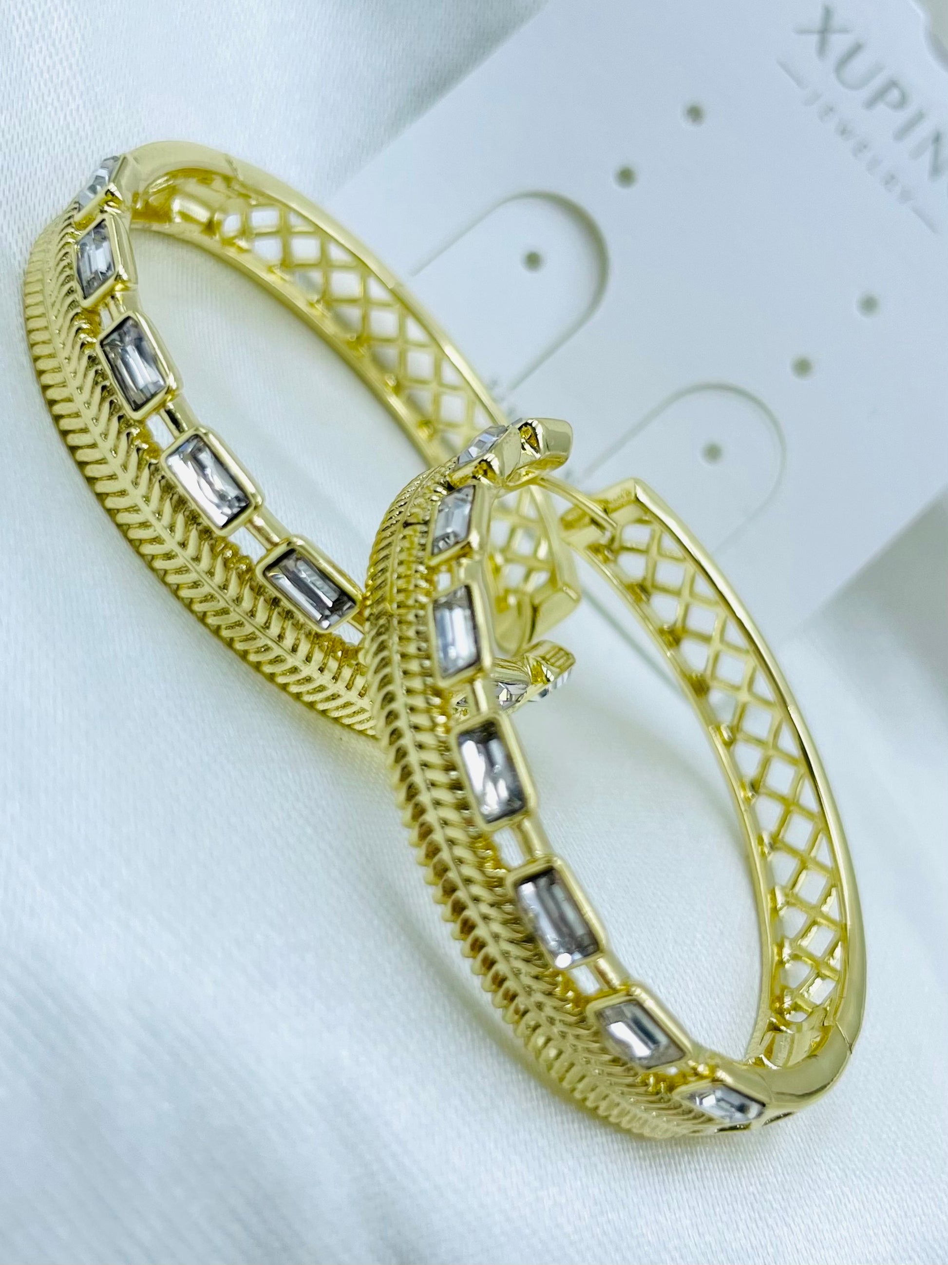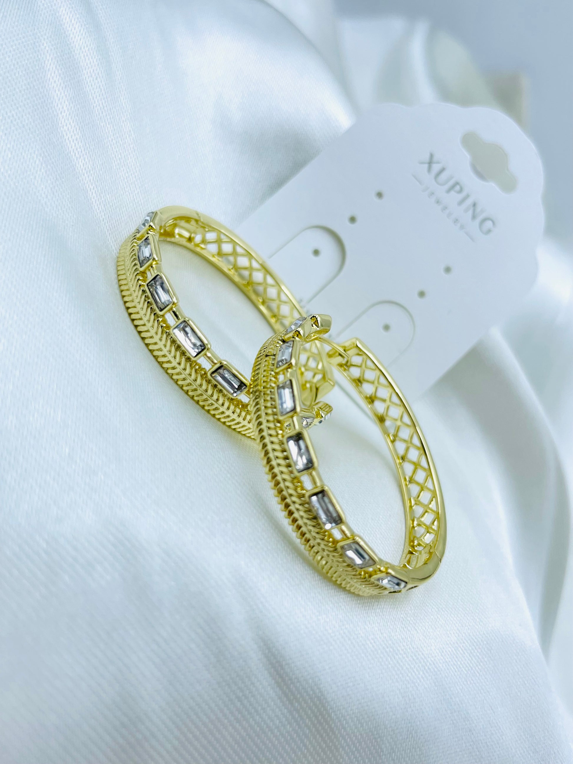 Esta hermosa arracada dorada es una verdadera joya, gracias a sus pequeños cristales rectangulares Swarovski que brindan un toque de elegancia y brillo. La presencia de la figura Jingjing en la pieza agrega un elemento adicional de diseño y carácter único. Perfecta para cualquier ocasión.