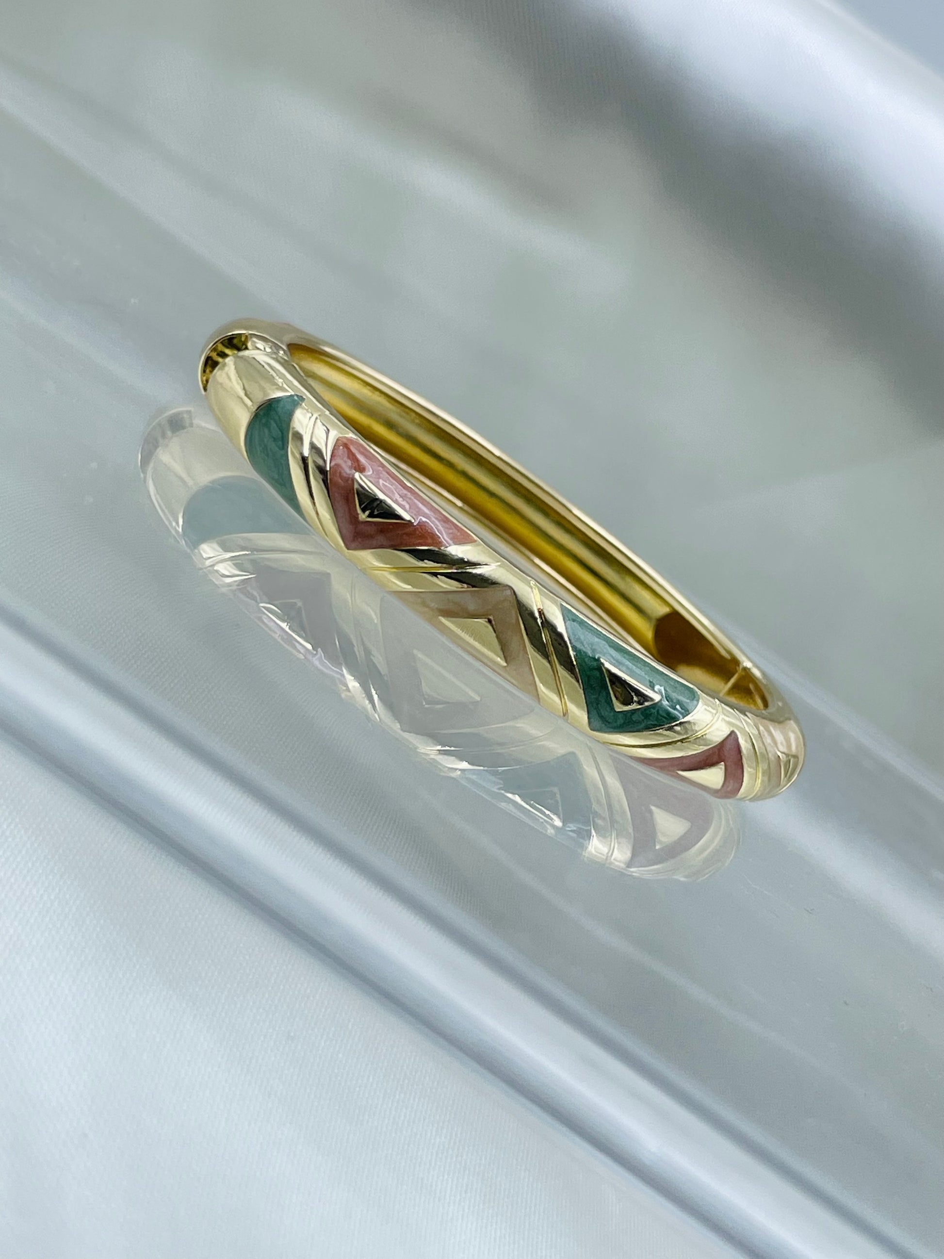 Este brazalete colorido está hecho de acero inoxidable de alta calidad, lo que lo hace resistente y duradero. Con su hermoso color dorado y detalles en rojo, verde y beige, es una pieza de joyería única que agregará un toque de color y elegancia a cualquier atuendo. ¡Haz una declaración de moda con este brazalete colorido!