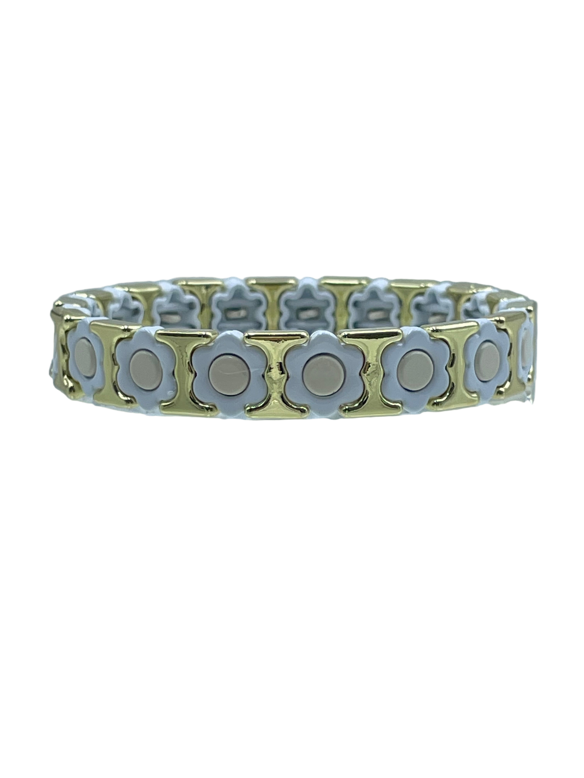 Este elegante brazalete dorado esmaltado con flores en color nude es el complemento perfecto para cualquier atuendo. Su diseño exquisito y detallado resalta la belleza de las flores, agregando un toque femenino y sofisticado a tu look. Hecho a mano con materiales de alta calidad, este brazalete seguramente será una pieza atemporal en tu colección de accesorios.