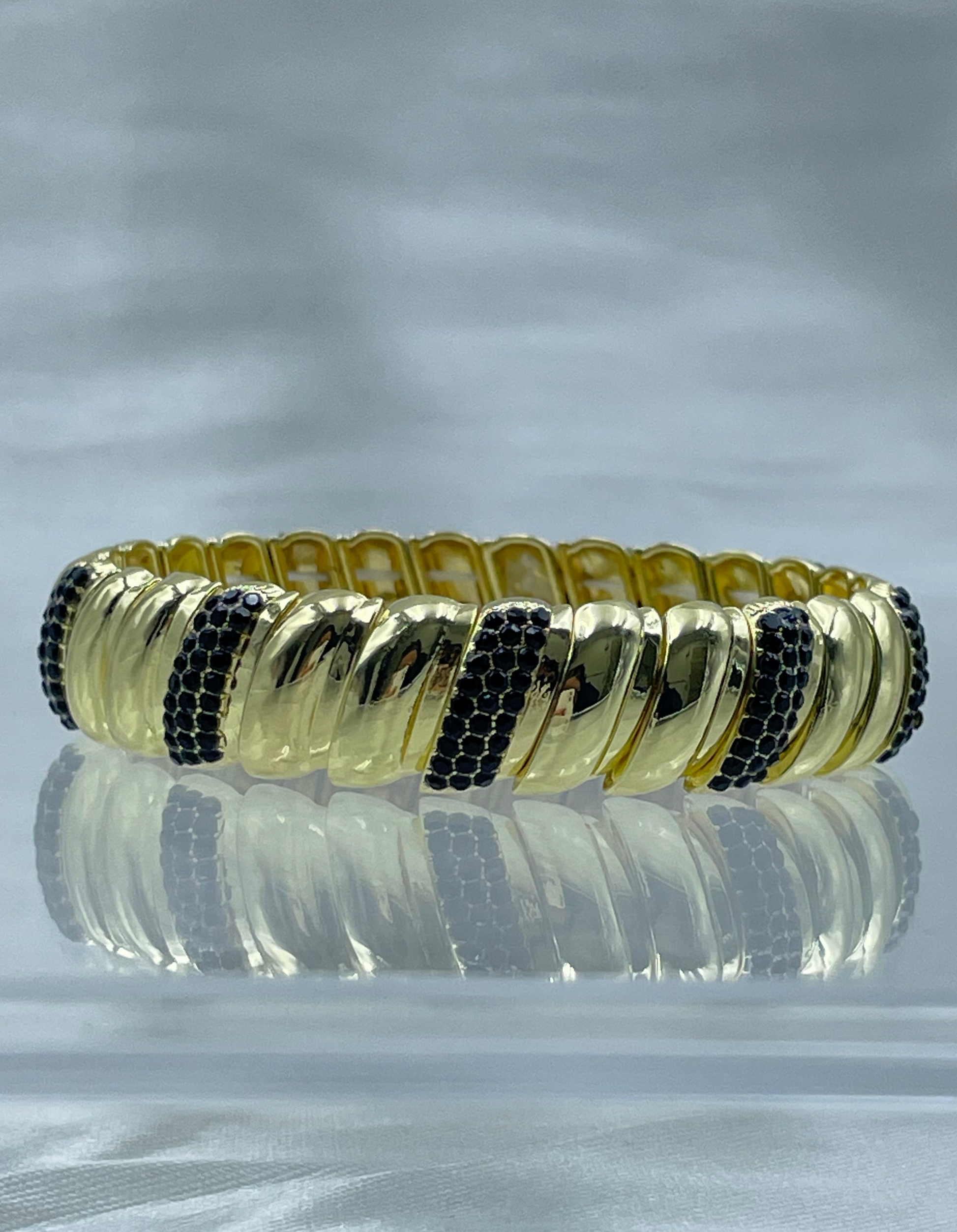 Este brazalete Esmaltado, bañado en oro y decorado con líneas negras, es una elección elegante para cualquier atuendo. Su diseño dorado aporta una sensación de lujo y sus detalles en esmalte negro le dan un toque moderno y sofisticado. Un accesorio imprescindible para realzar tu estilo con un toque de distinción.