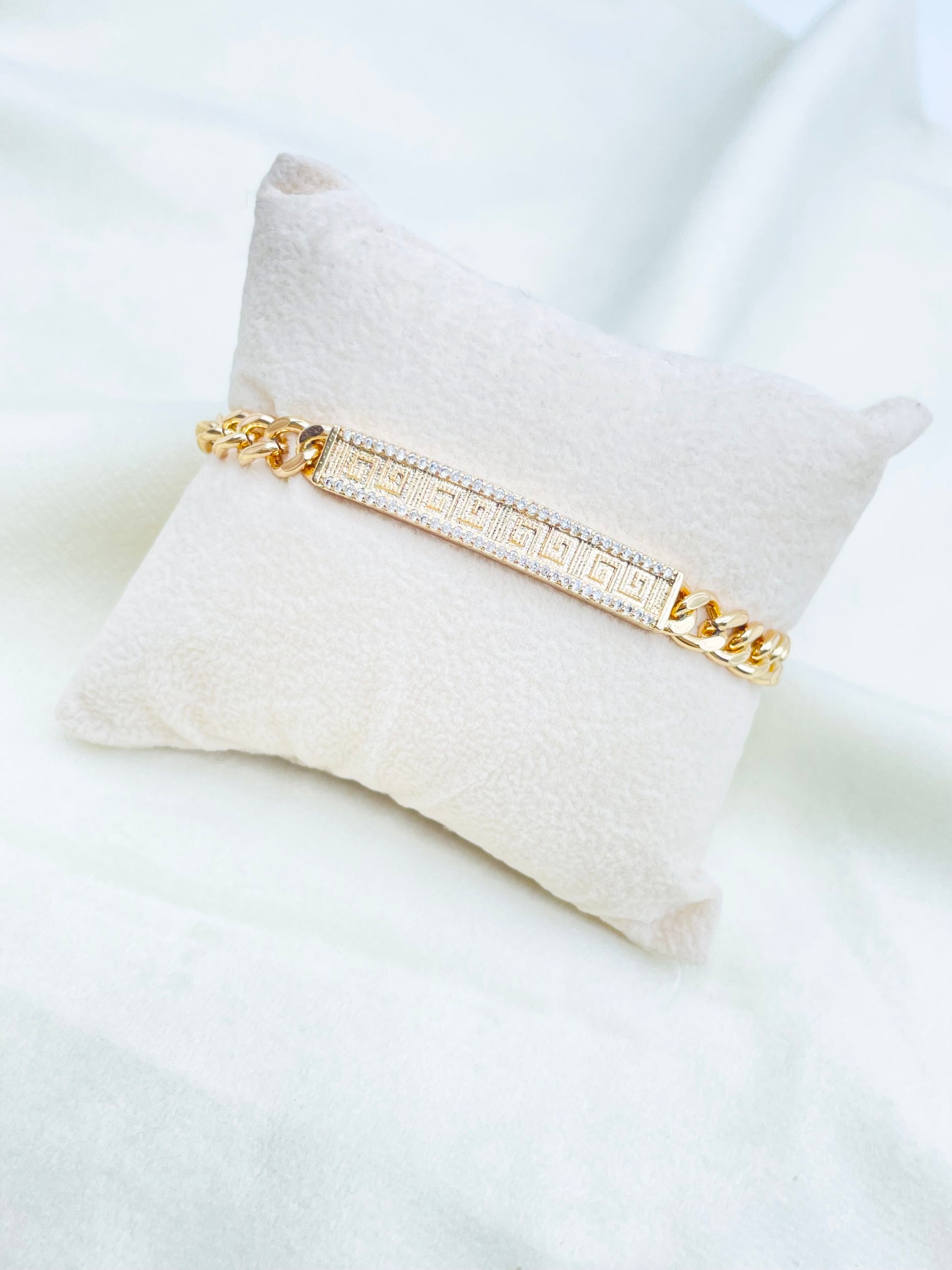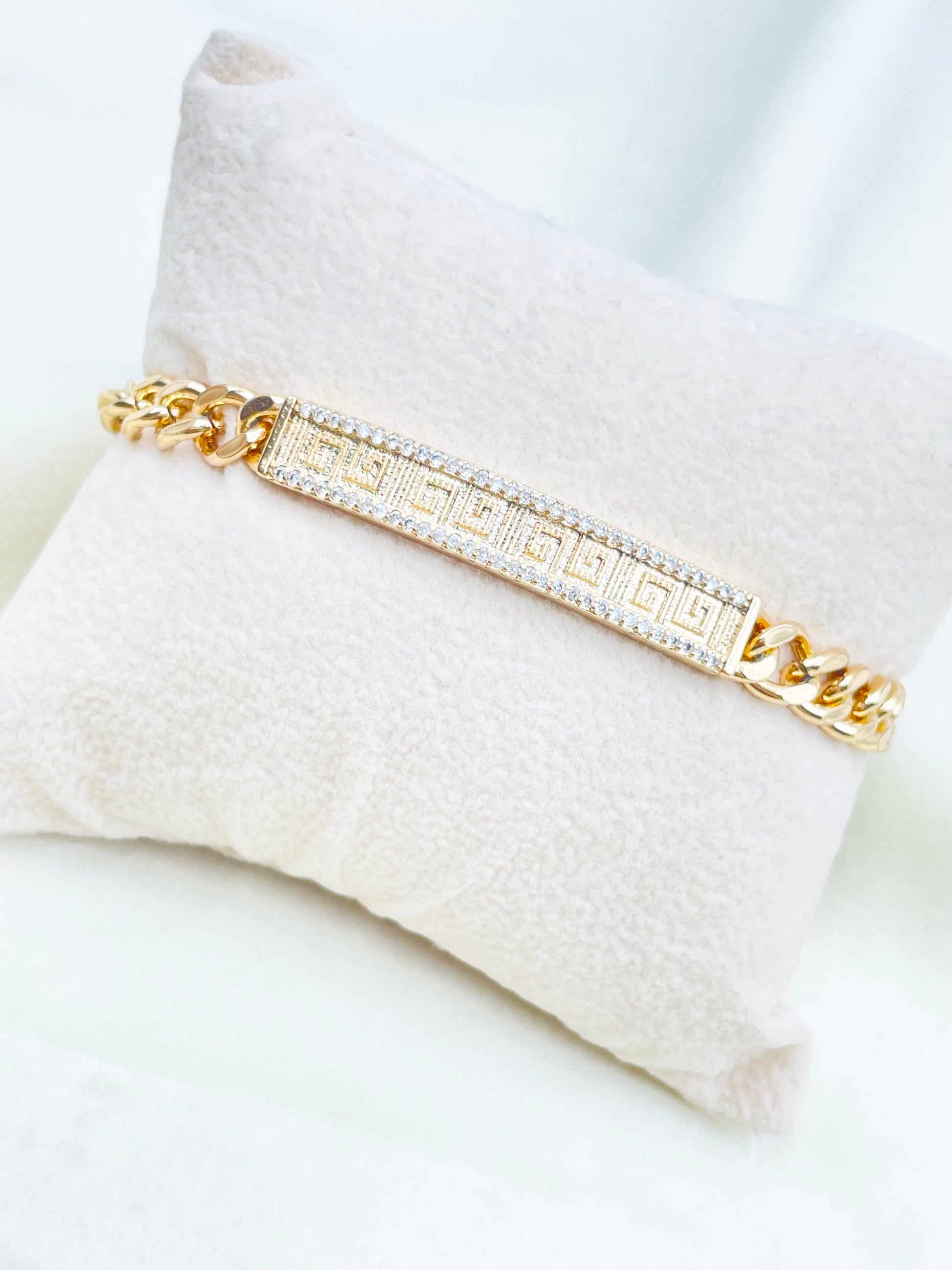 Descubre la elegante Esclava Xuping con su placa grabada con grecas y resplandecientes brillos. Hecha con materiales de calidad, esta esclava es el complemento perfecto para cualquier ocasión. Su diseño único y sofisticado te hará lucir con estilo y distinción. ¡Hazte con ella ahora y presume de un accesorio de moda que nunca pasa de moda!