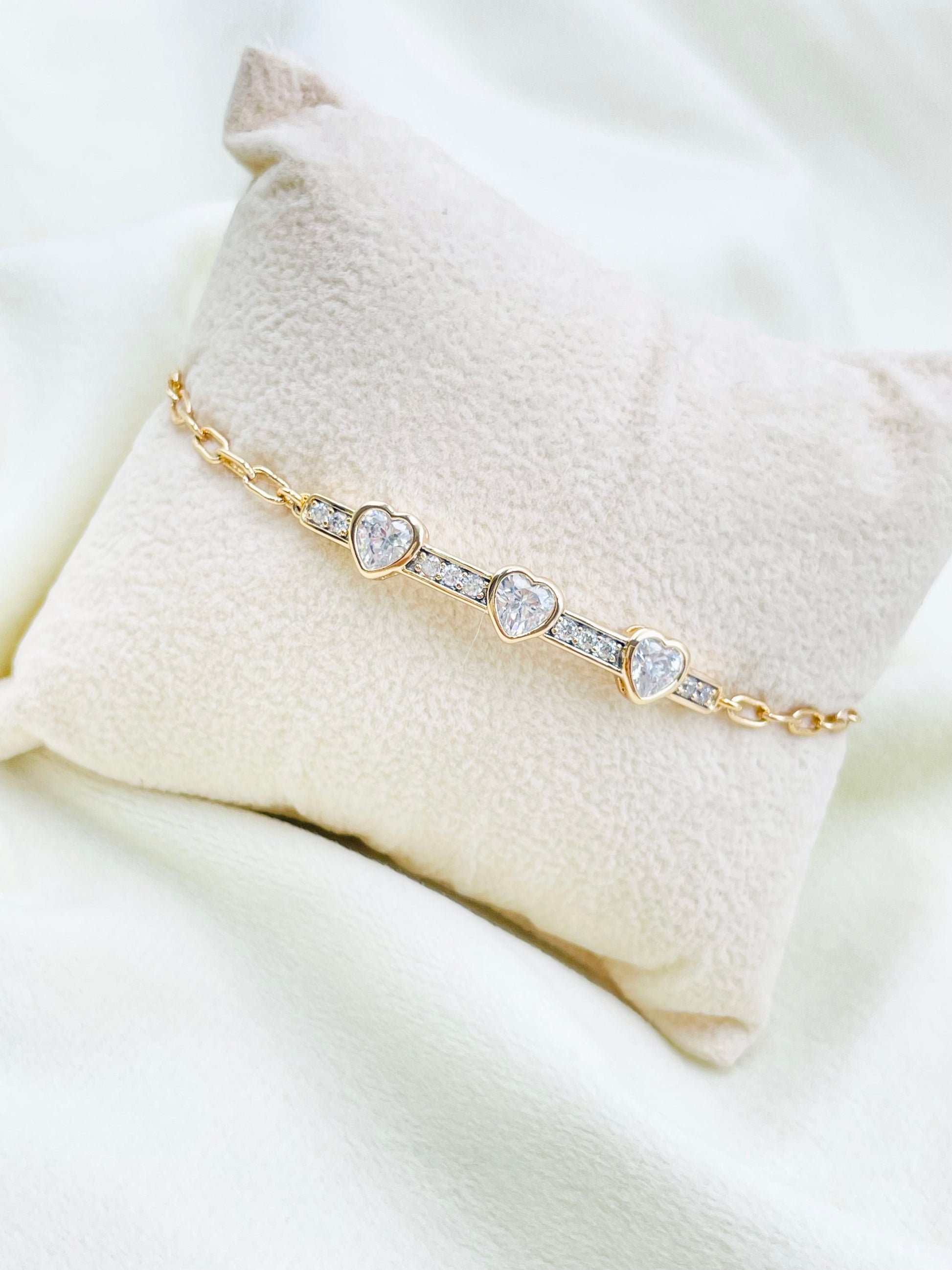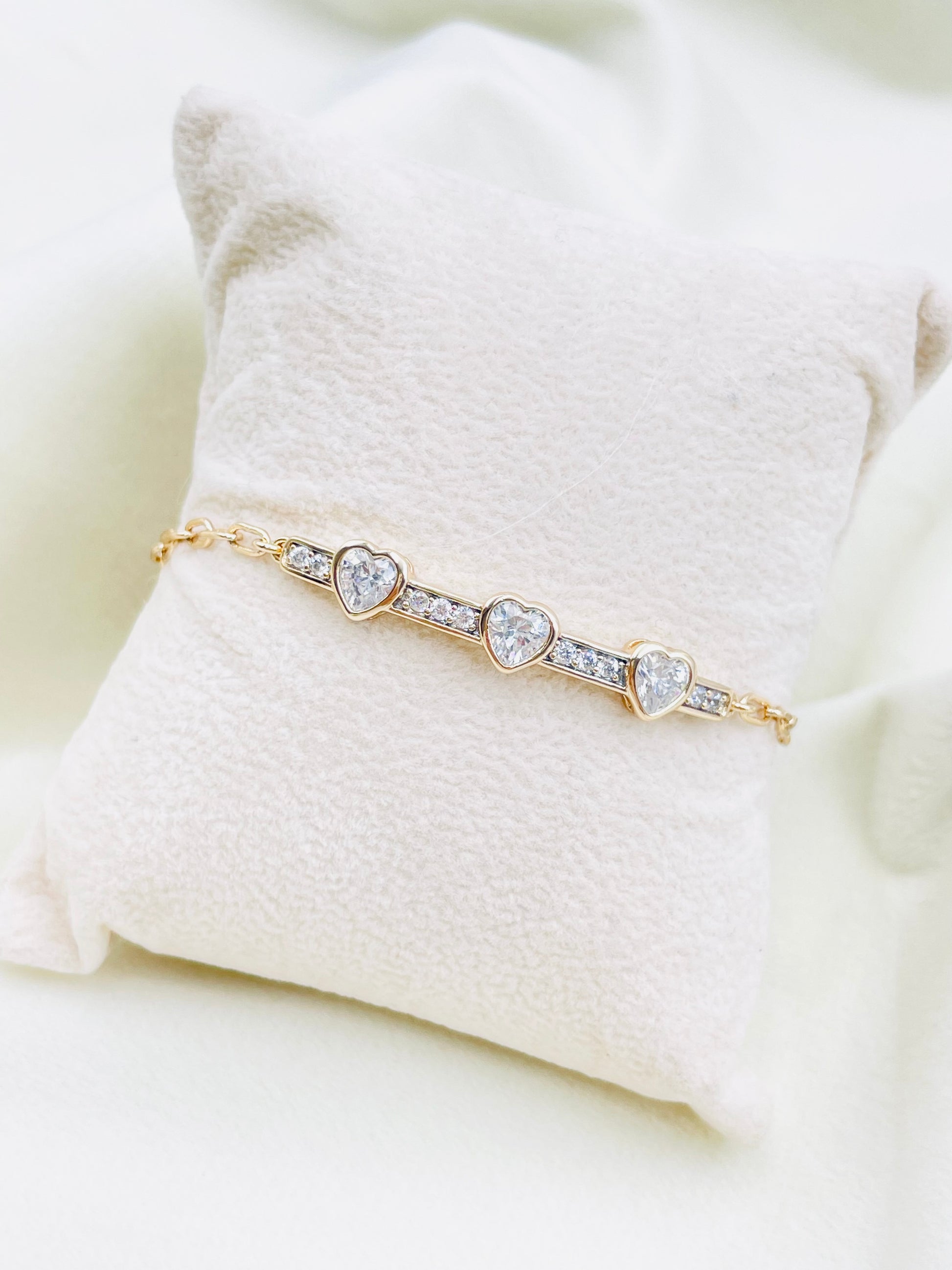 "Disfruta de un estilo elegante y femenino con la Esclava Xuping. Presenta una placa delgada con tres corazones de brillos, agregando un toque de romance a tu atuendo. Hecha con materiales de alta calidad que garantizan su durabilidad y brillo. Completa tu look con esta hermosa pieza."