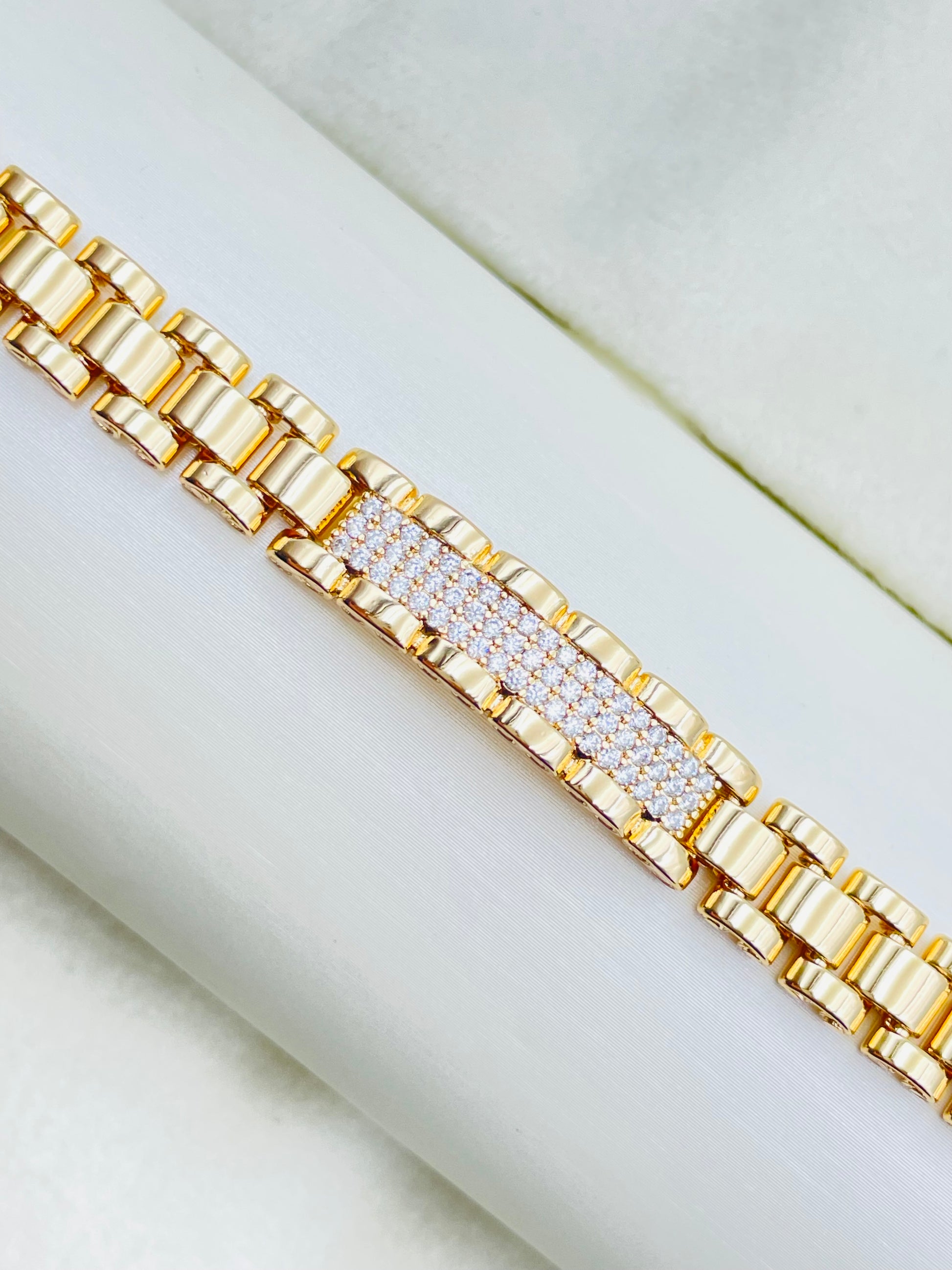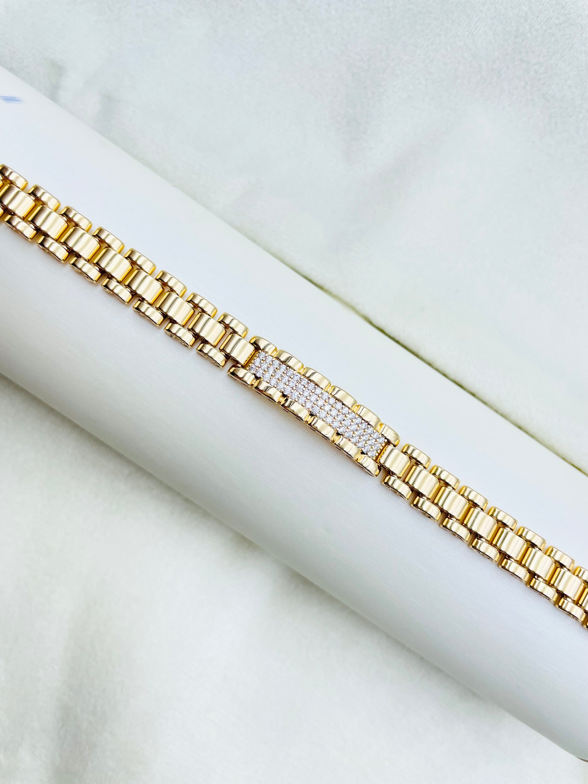 Esta esclava Xuping está diseñada con una cadena tipo Rolex y una placa gruesa con brillos, todo elaborado en oro rosado. Con un estilo elegante y llamativo, esta esclava es perfecta para añadir un toque de sofisticación a cualquier conjunto. Lucirá increíble en cualquier ocasión y será la pieza central de tu joyería.