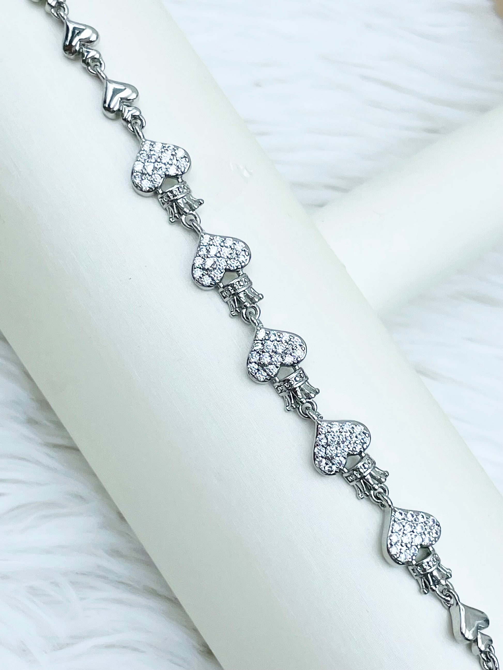 Esta pulsera plateada está hecha de acero de alta calidad y cuenta con un elegante baño de rodio. Los corazones brillantes a lo largo de la pulsera le dan un toque de glamour y encanto. Con esta pulsera, puedes lucir con estilo y elegancia en cualquier ocasión.