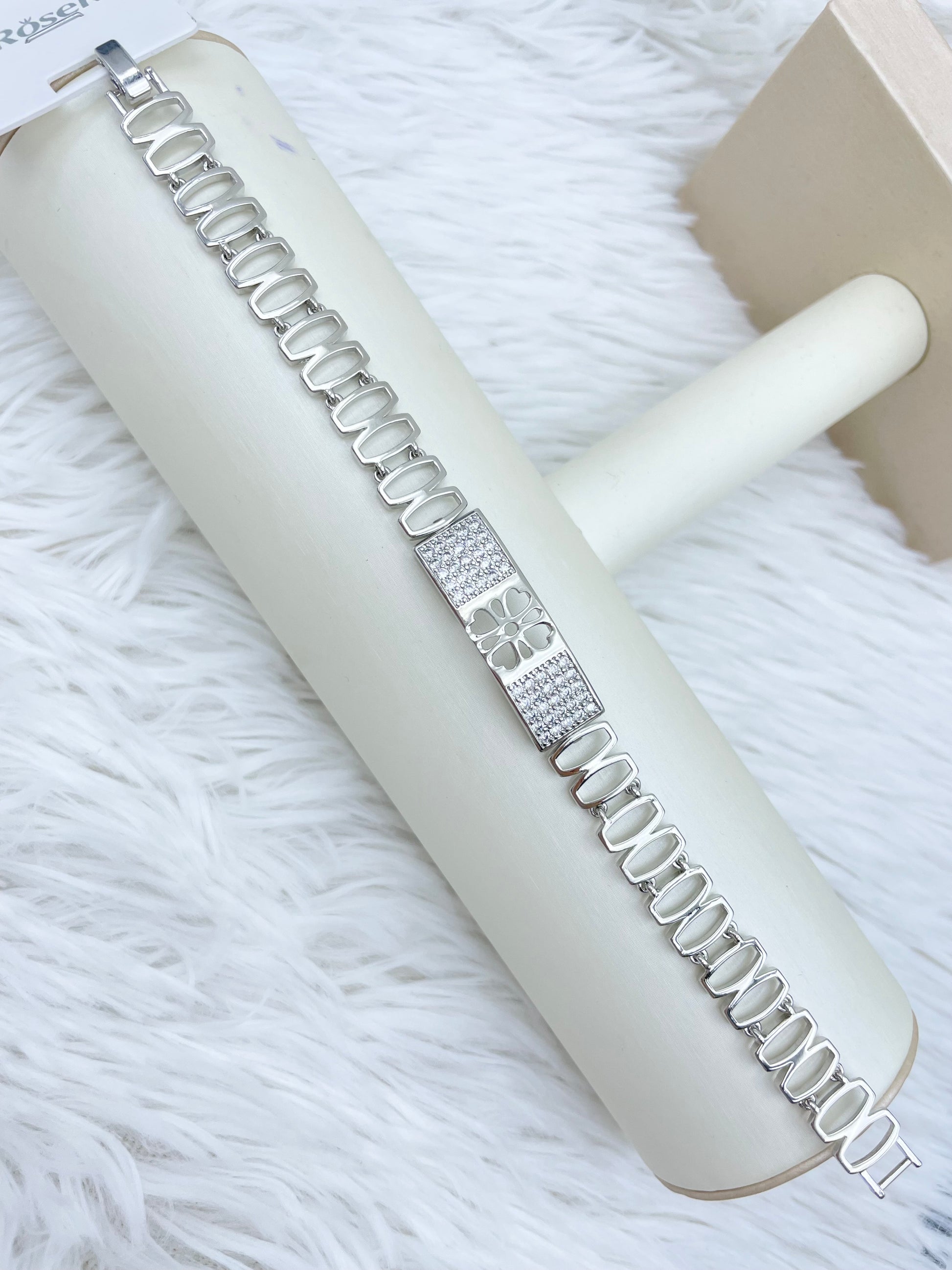 Esta pulsera plateada es el complemento perfecto para cualquier atuendo. Fabricada en acero de alta calidad y con un baño de rodio, esta pulsera es resistente y duradera. La placa gruesa le da un toque elegante y moderno, haciendo que sea una pieza única en tu colección de joyería. ¡Hazte con ella ahora!