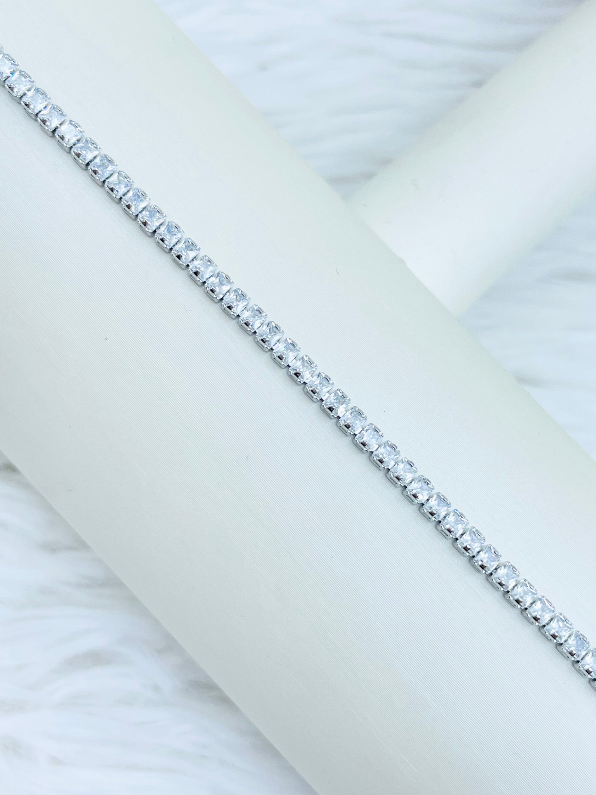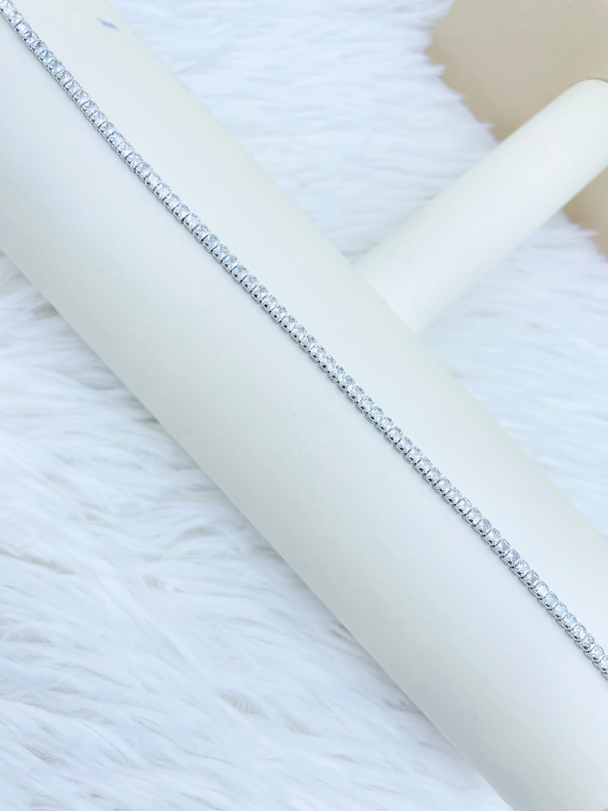 Esta pulsera plateada es un accesorio elegante y sofisticado que no puede faltar en tu colección. Cuenta con una cadena delgada y delicada, adornada con mini zirconias que le dan un brillo sutil pero impactante. Perfecta para lucir en cualquier ocasión y añadir un toque de glamour a tu look.