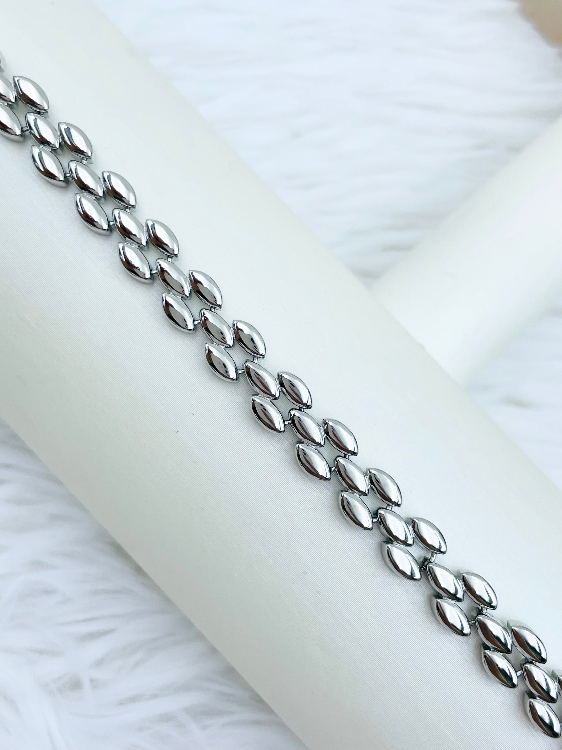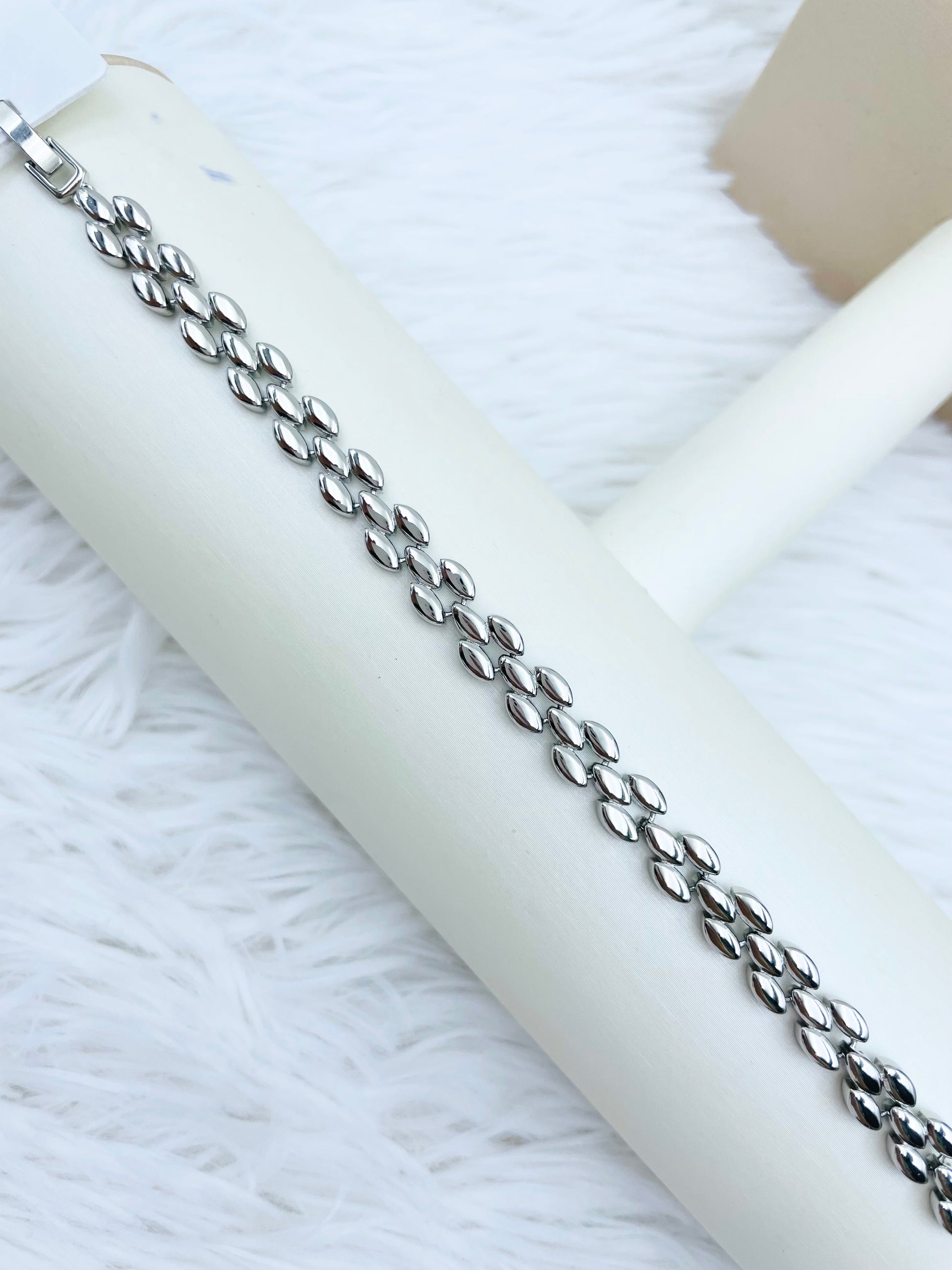 Esta elegante pulsera de acero con baño de rodio es perfecta para cualquier ocasión. Su diseño sencillo la hace versátil y fácil de combinar con cualquier atuendo. Además, su material de alta calidad garantiza durabilidad y un brillo duradero. Hazte con ella hoy mismo y añade un toque de sofisticación a tu estilo.