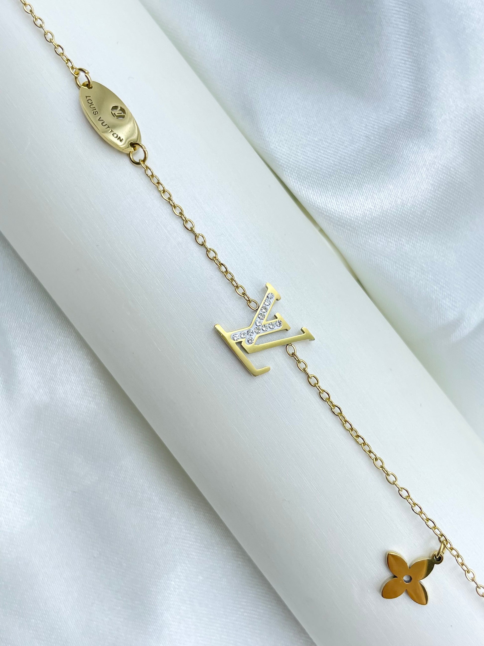 La Pulsera Rosek es el accesorio perfecto para complementar tu estilo. Hecha de acero inoxidable, su diseño delgado con el símbolo "LV" en el centro y pequeños dijes de imitación de Louis Vuitton la hacen elegante y sofisticada. ¡Atrévete a lucir como toda una experta en moda con esta pulsera única en su tipo!