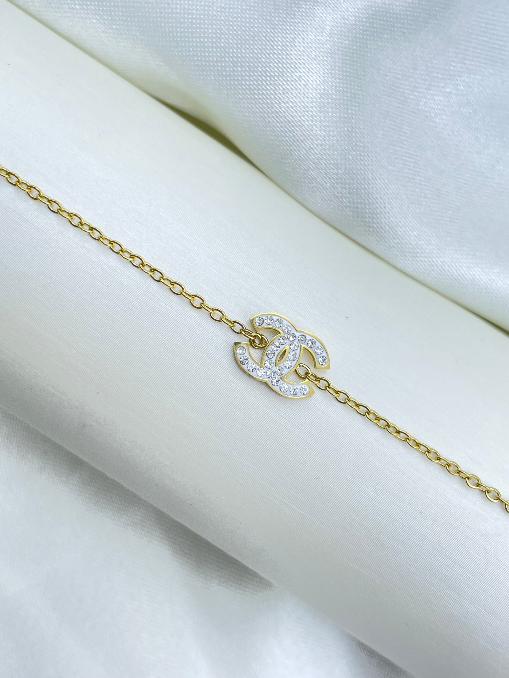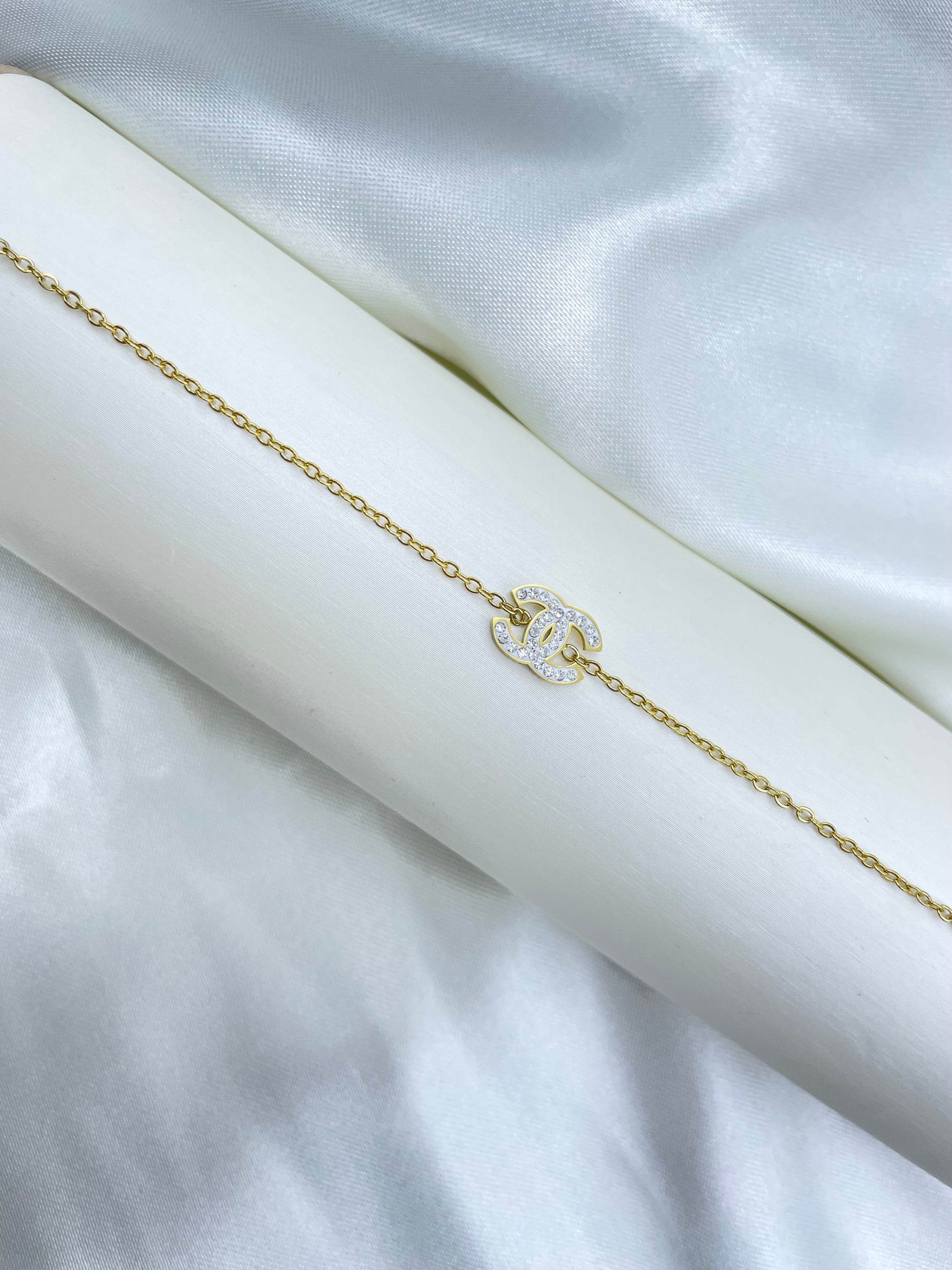 Presentamos nuestra elegante Pulsera Rosek. Hecha de acero inoxidable y con un delgado diseño, esta pulsera cuenta con un impresionante logotipo de brillos en el centro, inspirado en la famosa marca Chanel. ¡Completa tu look con esta pieza de estilo y calidad!