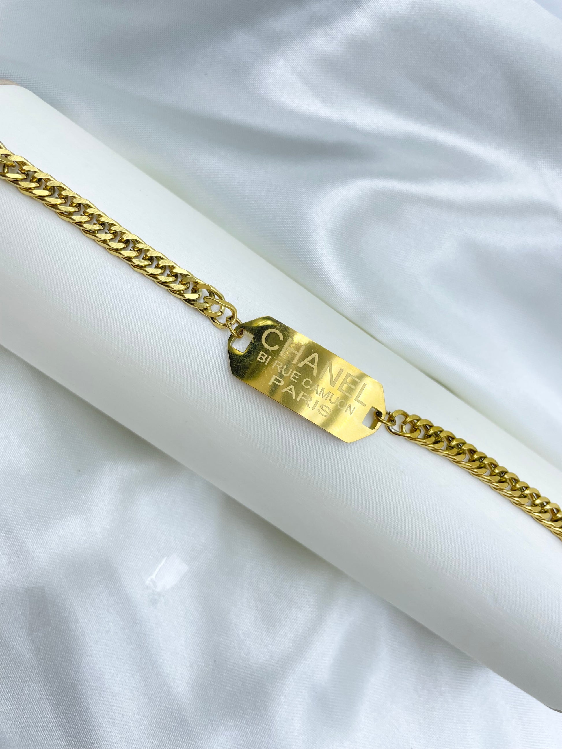 Esta pulsera Rosek está hecha con acero inoxidable y cuenta con una cadena resistente y una placa gruesa con la icónica frase grabada de la marca Chanel. Con su elegante diseño y calidad duradera, es el complemento perfecto para cualquier estilo. ¡Haz una declaración de moda con esta pulsera de alta calidad!