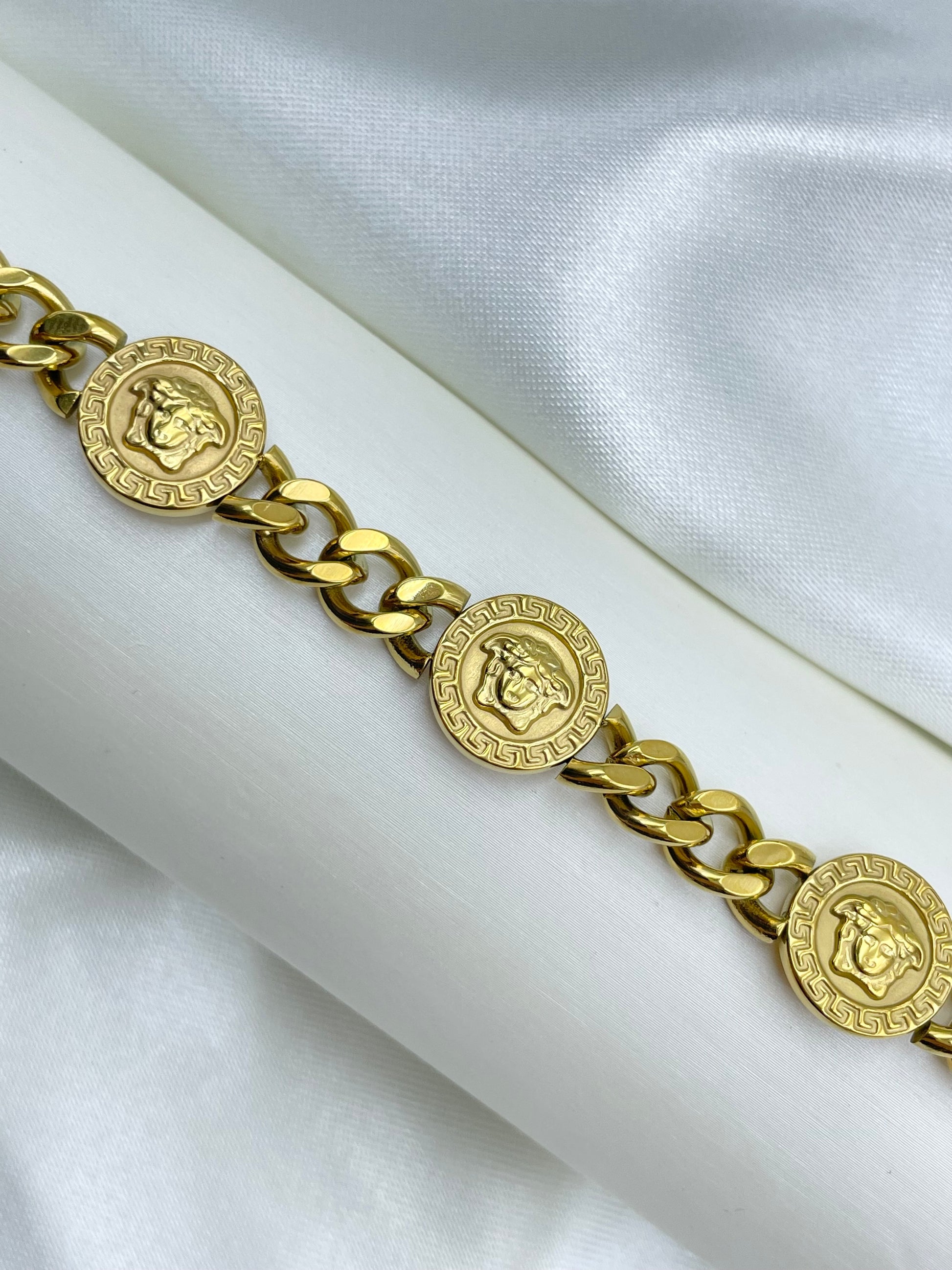 Esta pulsera de acero inoxidable es la combinación perfecta de elegancia y estilo. Con tres figuras de logotipo de la famosa marca Versace, lucirás sofisticado y a la moda. Además, su resistencia y durabilidad te acompañarán en todas tus actividades. ¡Haz una declaración de moda con esta pulsera única!