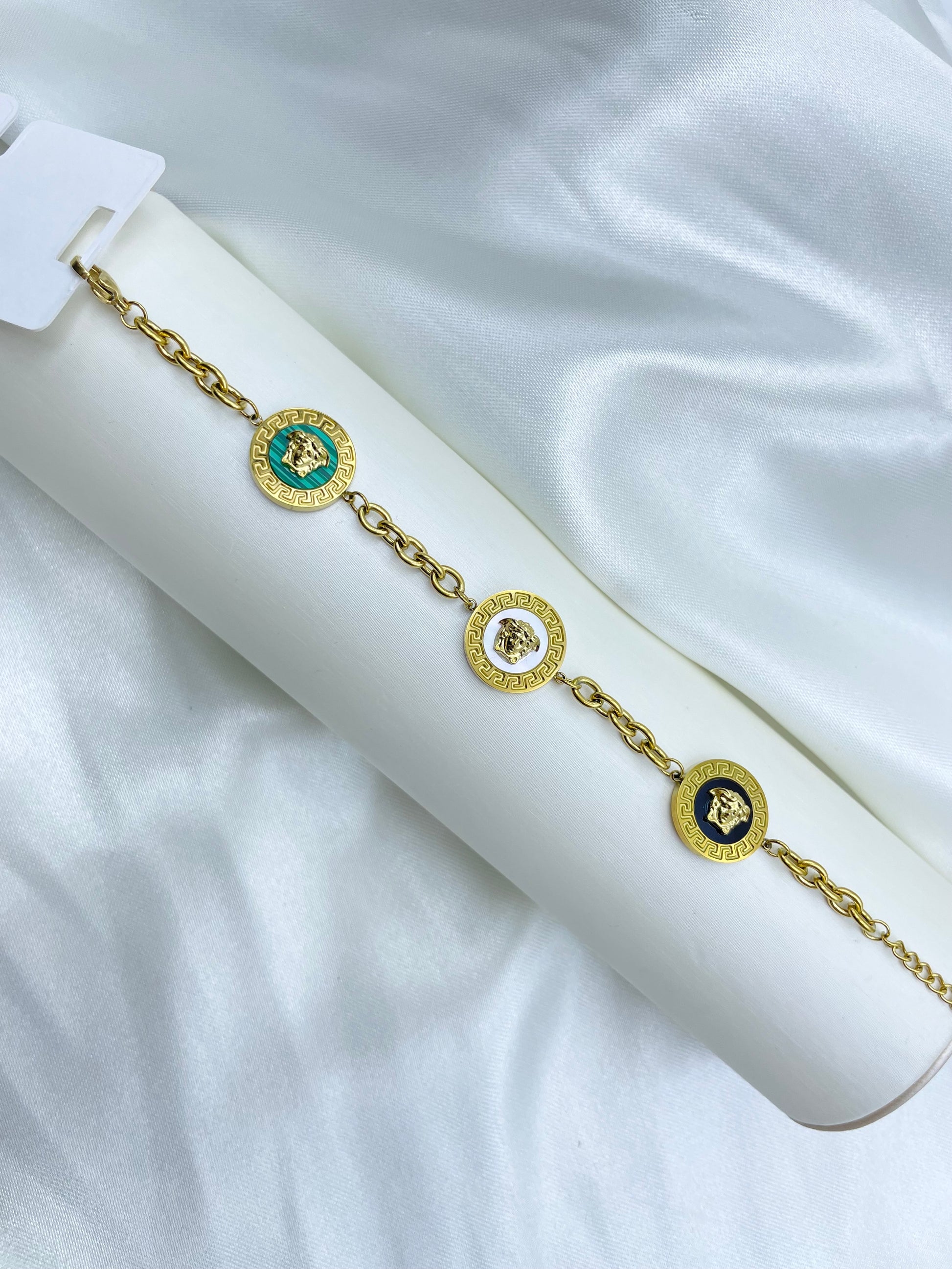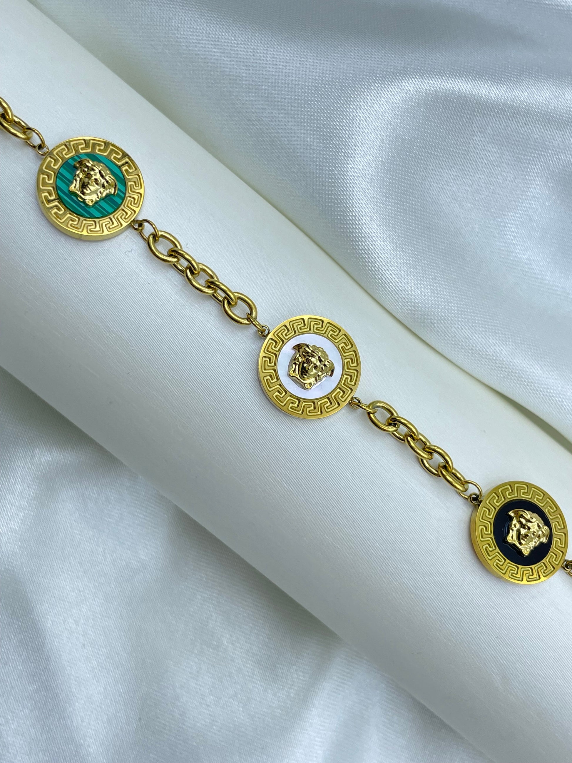 Esta pulsera de imitación marca Versace presenta un diseño elegante con tres figuras del logotipo en una delicada cadena de acero inoxidable. Perfecta para darle un toque de estilo a cualquier outfit. Dale un toque de lujo a tu look con esta pulsera Rosek.