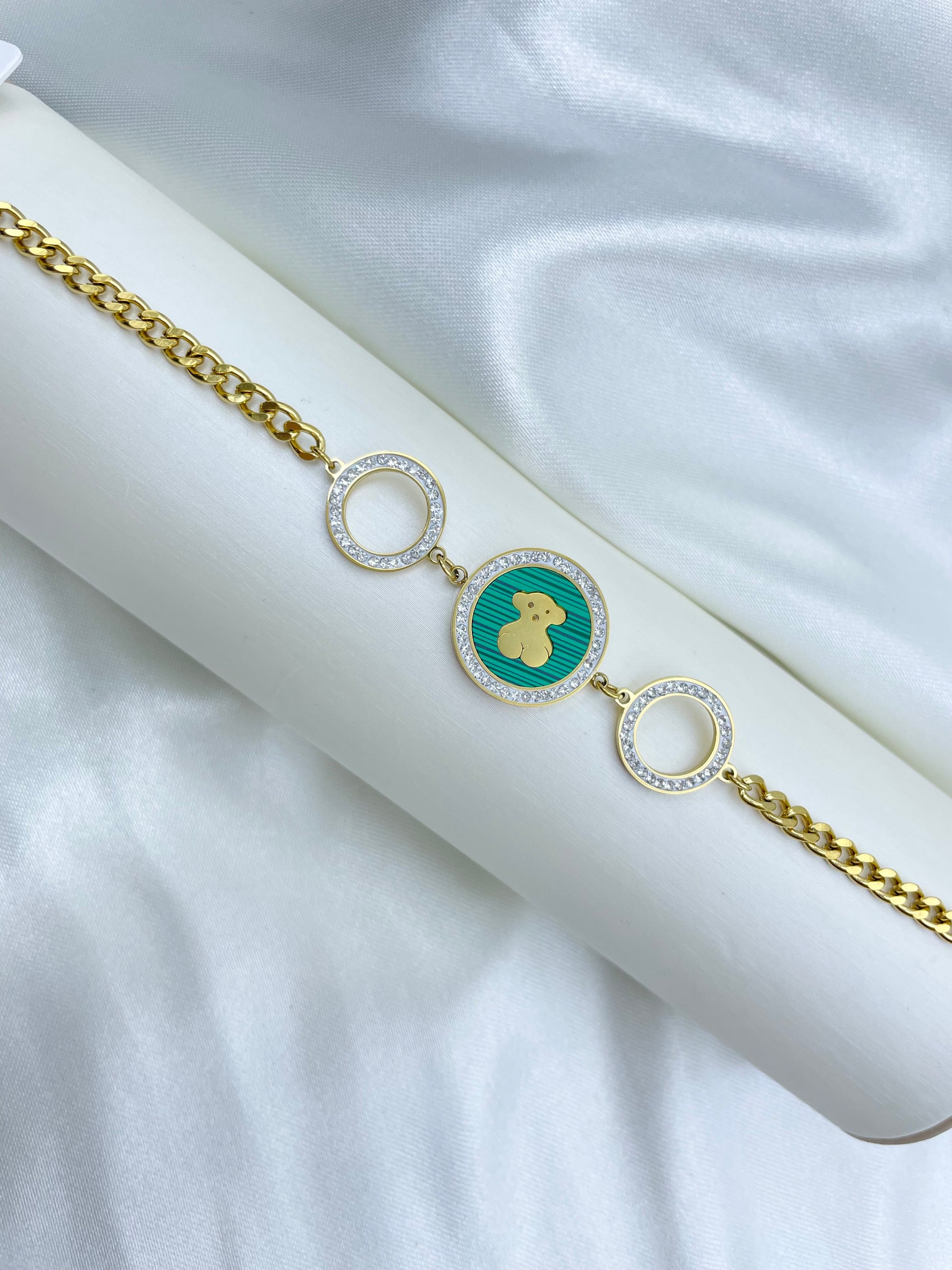 Esta pulsera Rosek es la combinación perfecta de elegancia y originalidad. Con su cadena delgada y diseño único inspirado en la reconocida marca Tous, hará que tu muñeca luzca hermosa. Además, su pequeño logotipo en círculo en color verde le da un toque moderno. ¡Atrévete a lucir esta pulsera y robar todas las miradas!