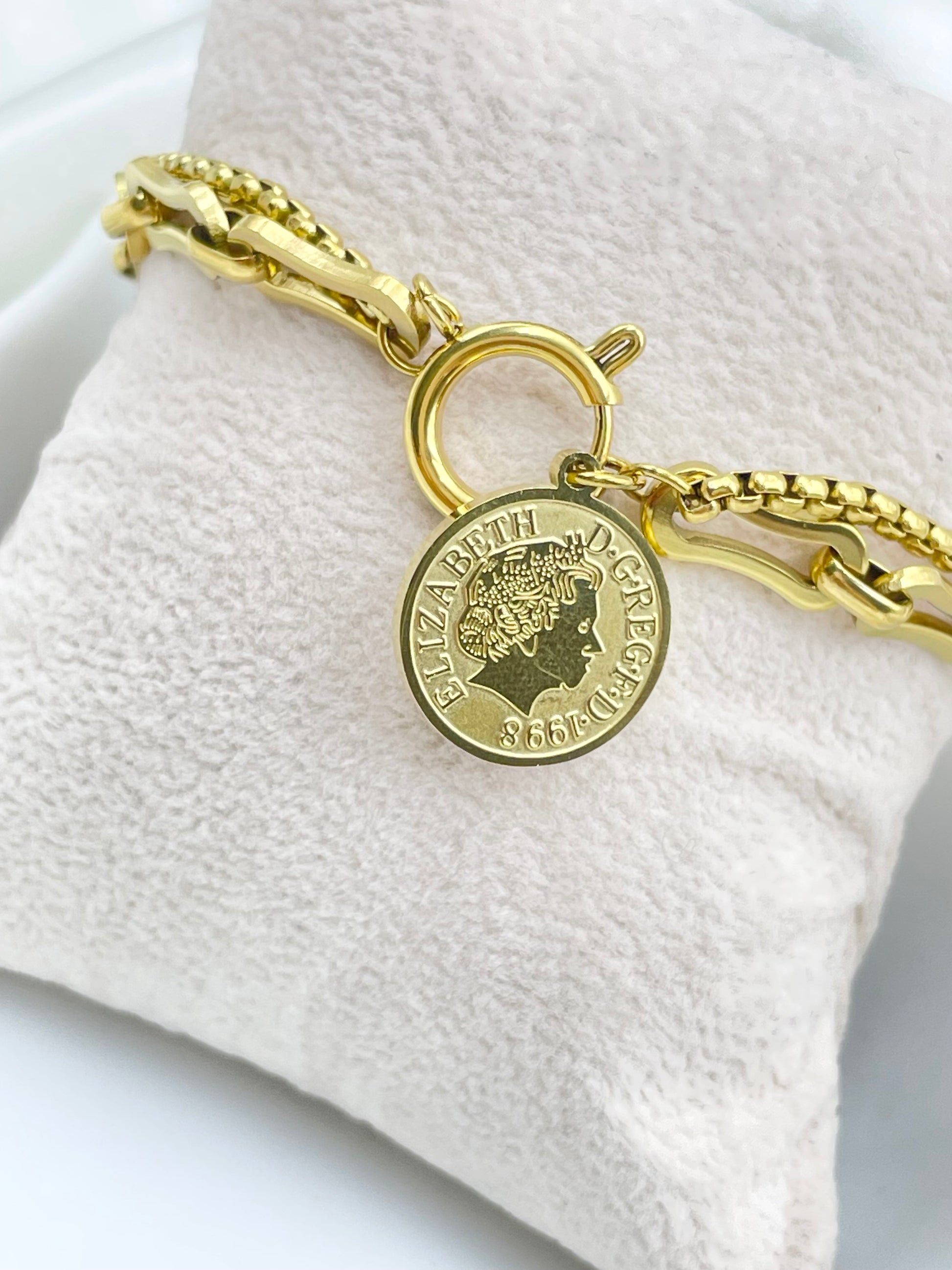 La Pulsera Rosek está hecha de acero inoxidable y cuenta con un cierre de anilla de resorte para mayor seguridad. Además, presenta un hermoso dije de moneda de la Reyna Isabel que le da un toque de elegancia y sofisticación a tu atuendo. Descubre la belleza y calidad de la Pulsera Rosek.