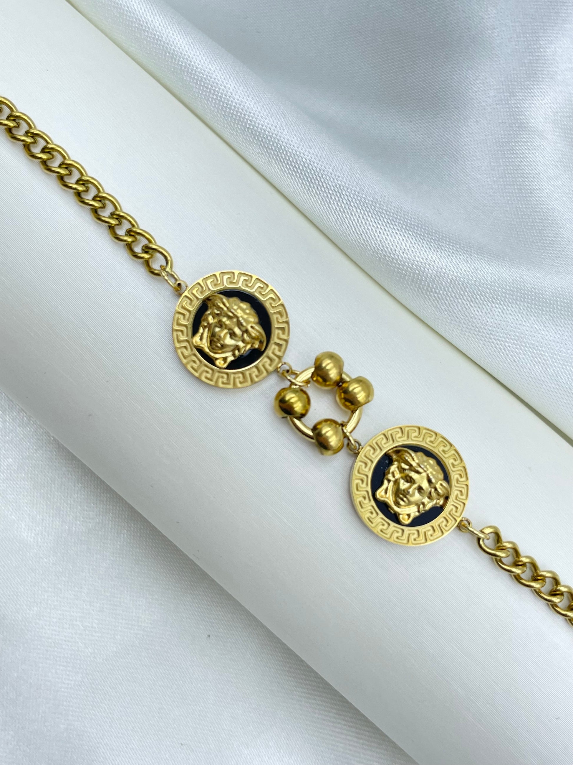 Pulsera de acero inoxidable con doble dije grabado, inspirada en el estilo de Versace. Esta moderna pulsera es perfecta para cualquier ocasión y su diseño clásico hará que se destaque en cualquier atuendo. Hecha con acero duradero y grabada con el icónico logotipo de Versace, esta pulsera es una adición elegante y versátil a tu colección de joyas.