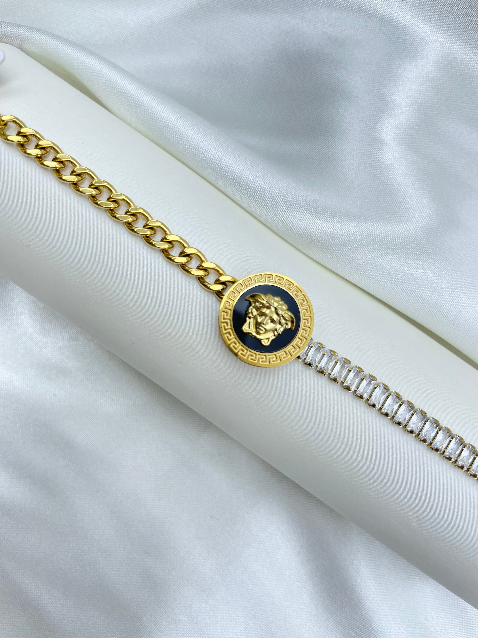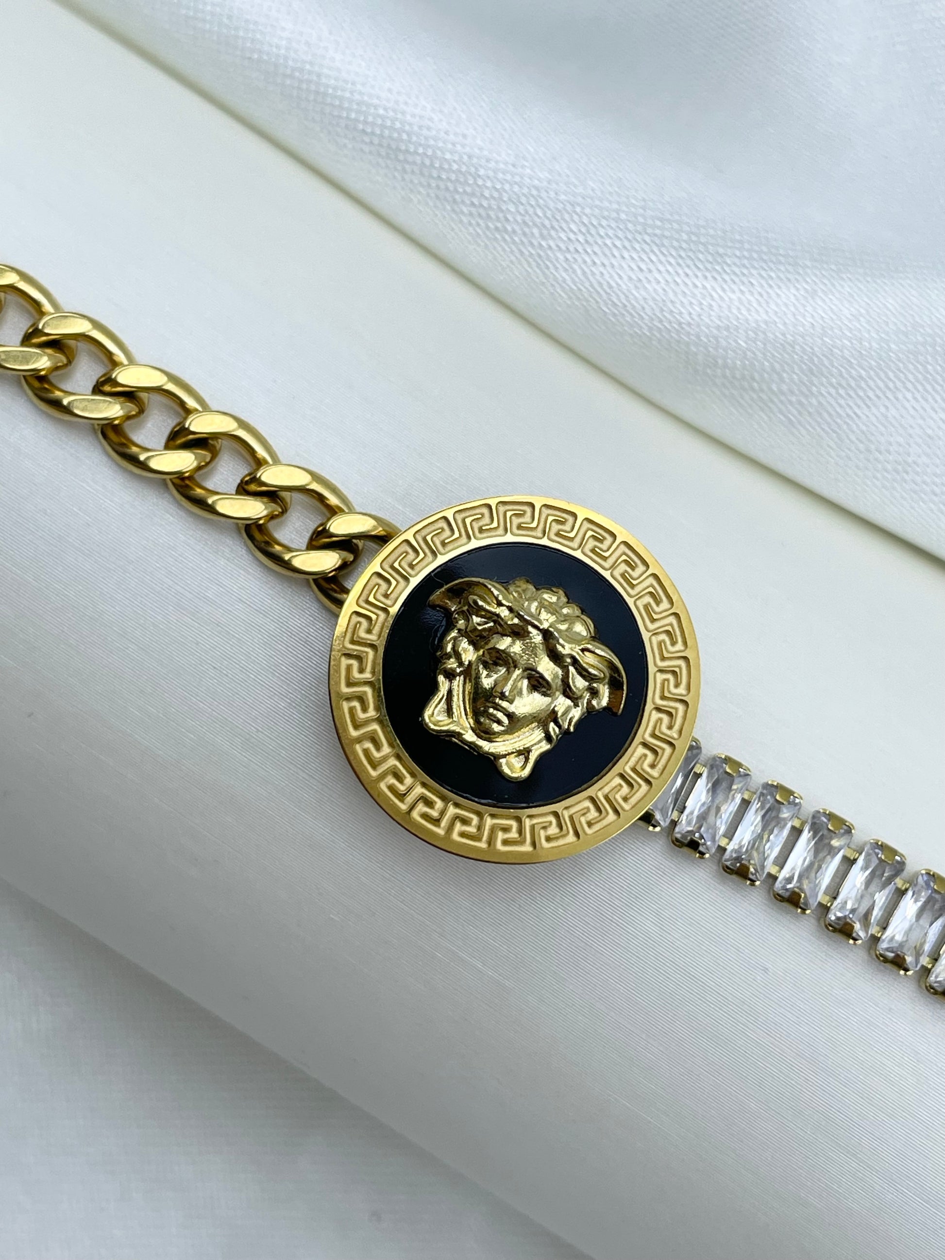 "Proyecta elegancia y estilo con nuestra pulsera de acero inoxidable, inspirada en la marca Versace y adornada con brillantes cristales. Un accesorio de alta calidad para destacar en cualquier ocasión."