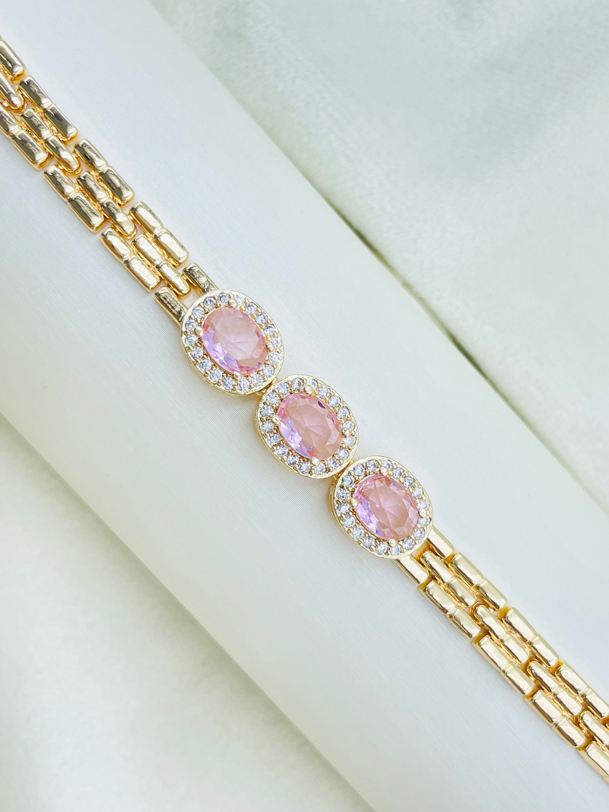 La pulsera Xuping con cadena eslabón bismark de 3 filas y zirconias en color rosa es una elegante y sofisticada opción para complementar cualquier atuendo. Hecha con materiales de alta calidad, esta pulsera brinda un brillo único y duradero a quien la lleva puesta.