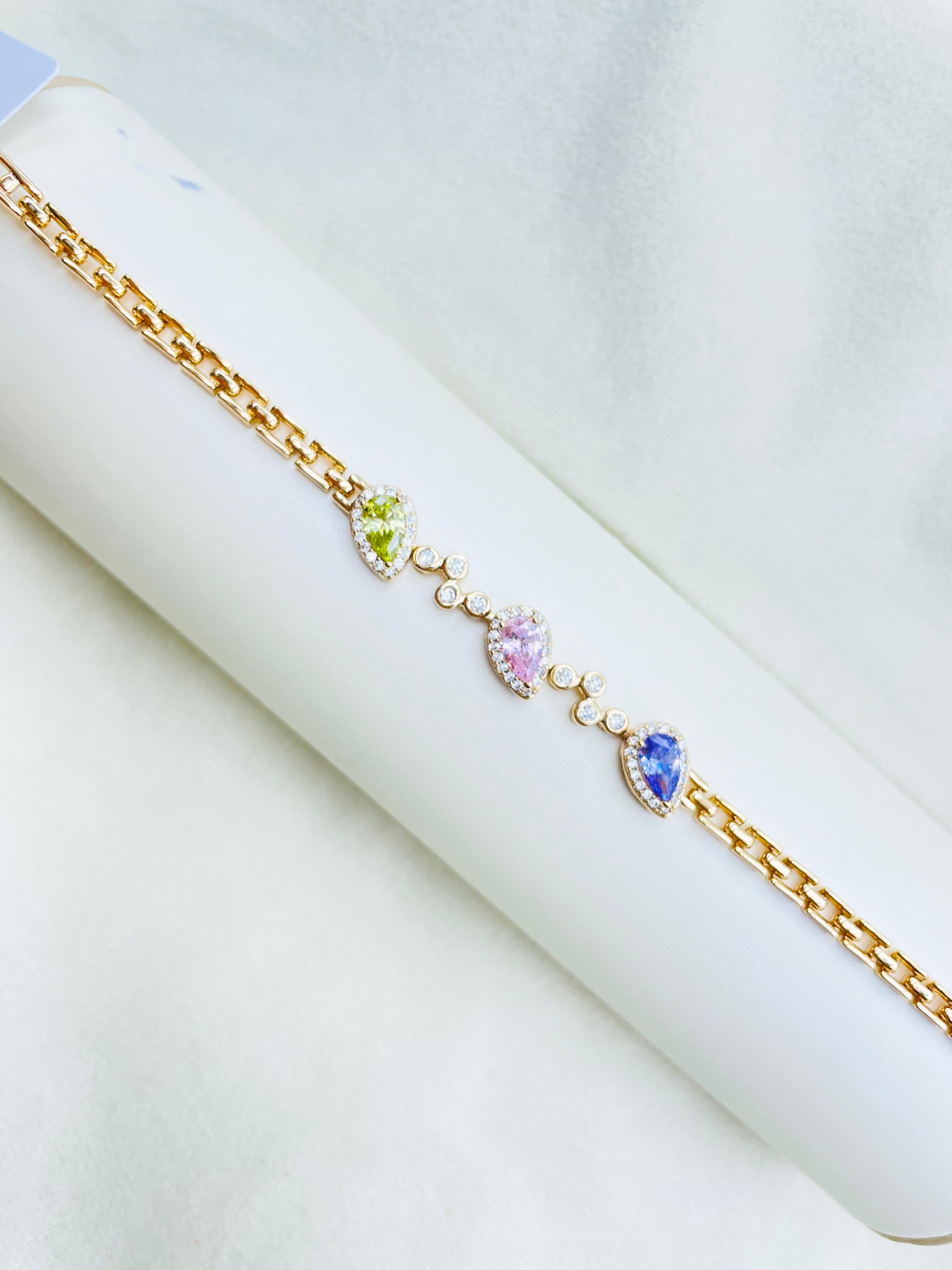 La Pulsera Xuping cuenta con eslabones cuadrados y zirconias de colores en forma de gota para un diseño elegante y sofisticado. Resalta tu estilo y añade brillo a tus atuendos con esta pulsera de alta calidad. Perfecta para cualquier ocasión y un excelente complemento para cualquier look.