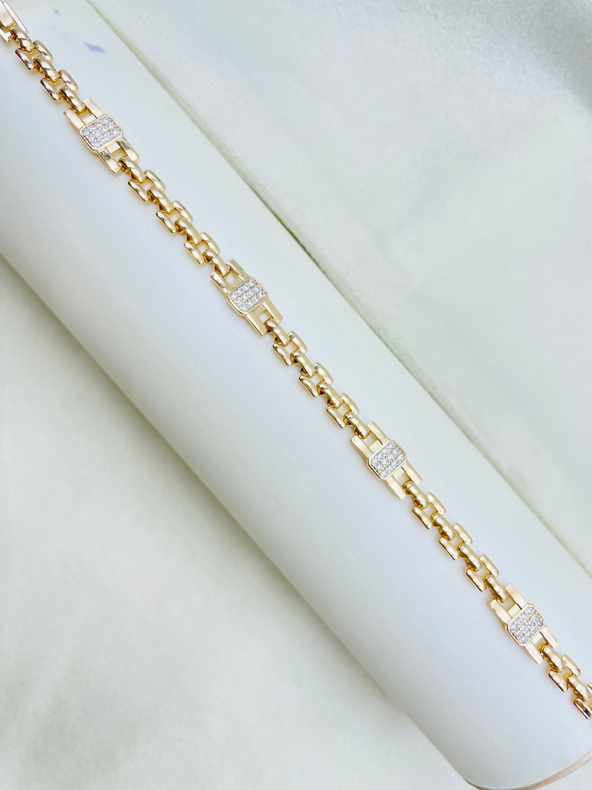 La pulsera Xuping es una pieza elegante y moderna, con eslabones cuadrados que brindan un toque de sofisticación. Sus eslabones de brillos en el centro añaden un toque de glamour y elegancia. Perfecta para complementar cualquier look y destacar en cualquier ocasión. ¡Haz que tu estilo brille con la pulsera Xuping!