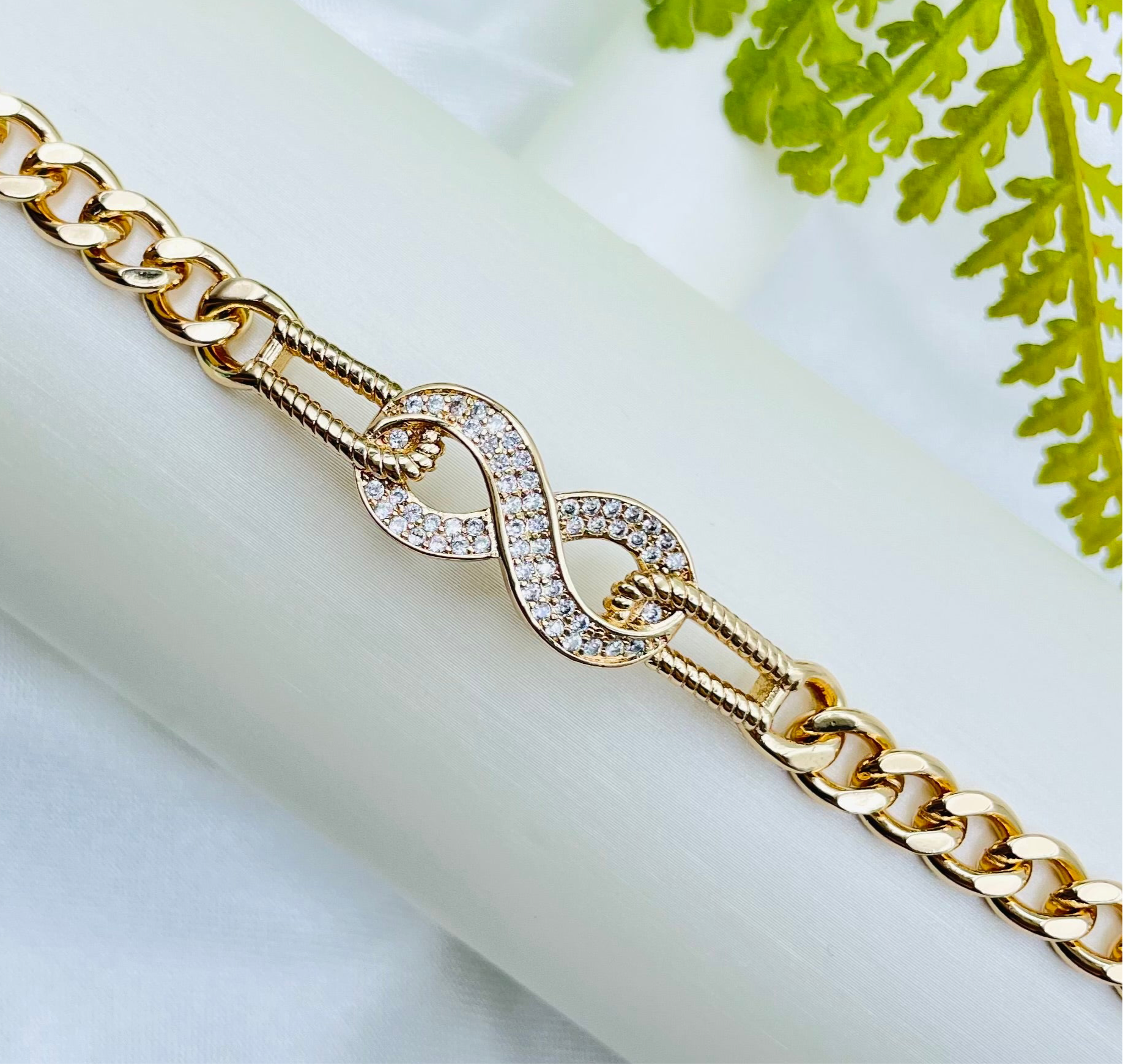 Descubre la elegante Pulsera Xuping con una placa en forma de infinito que cuenta con zirconia en todo el infinito, dando un toque de brillo y sofisticación a tu muñeca. Con un diseño moderno y refinado, esta pulsera es perfecta para complementar cualquier atuendo y resaltar tu estilo único.
