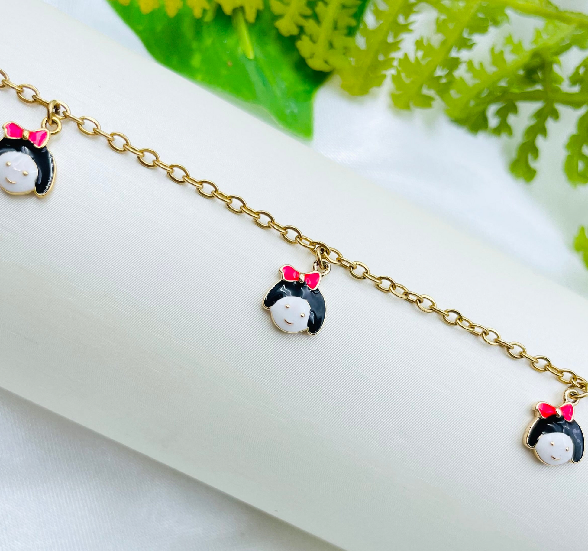 La pulsera Xuping es una pieza única y elegante con eslabones pequeños ovalados y 3 dijes en forma de muñecas con moño rojo. Hecha con materiales de alta calidad, esta pulsera es perfecta para añadir un toque femenino y de estilo a cualquier atuendo. Cada dije representa la felicidad y la buena suerte, convirtiendo esta pulsera no solo en un accesorio, sino en una pieza llena de significado.