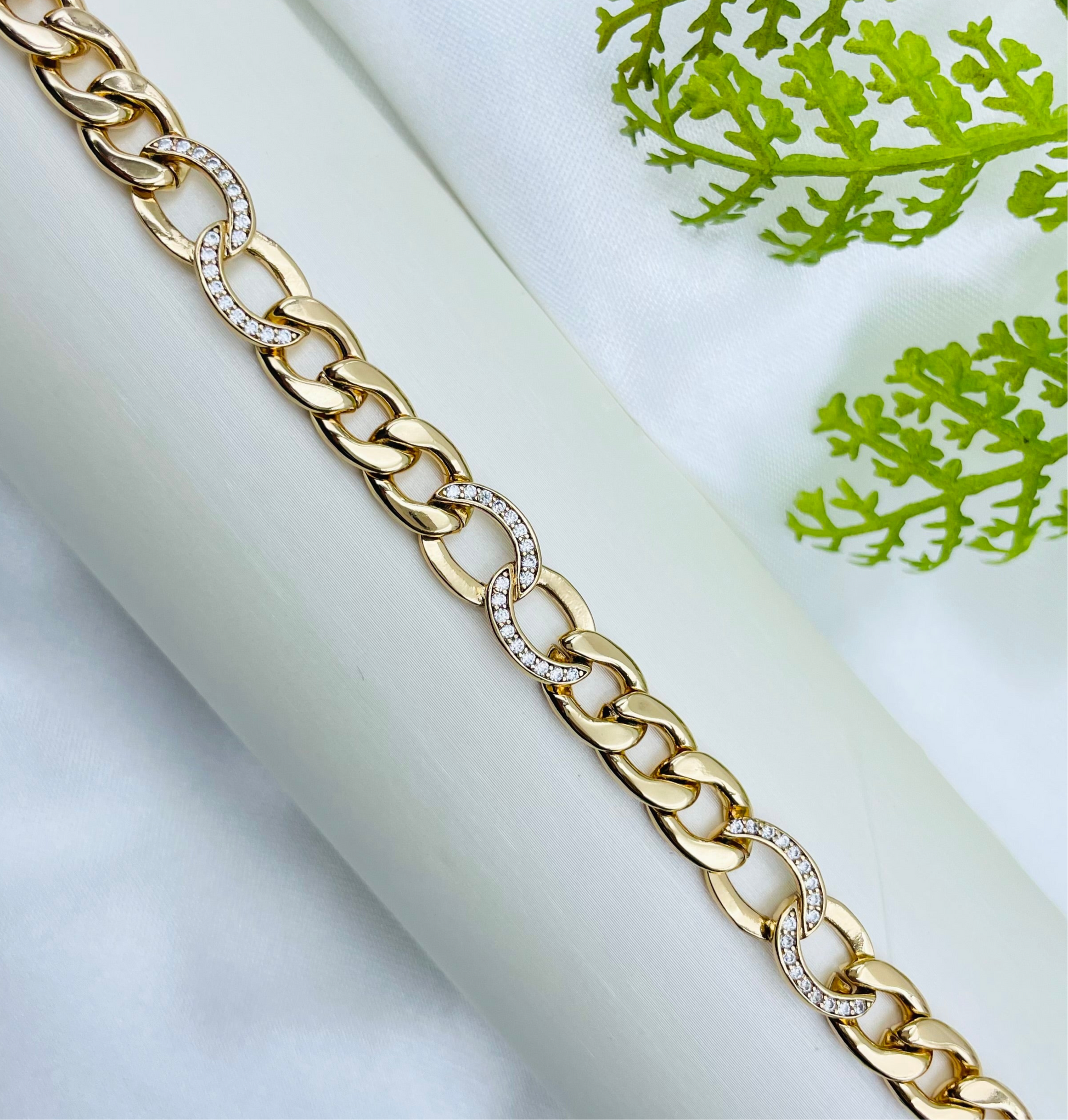 La pulsera Xuping es una elegante y única pieza de joyería con una cadena de eslabones barbada hueca. Los eslabones del medio están adornados con brillos que le dan un toque de sofisticación. Perfecta para cualquier ocasión, esta pulsera es una adición imprescindible a tu colección de accesorios.