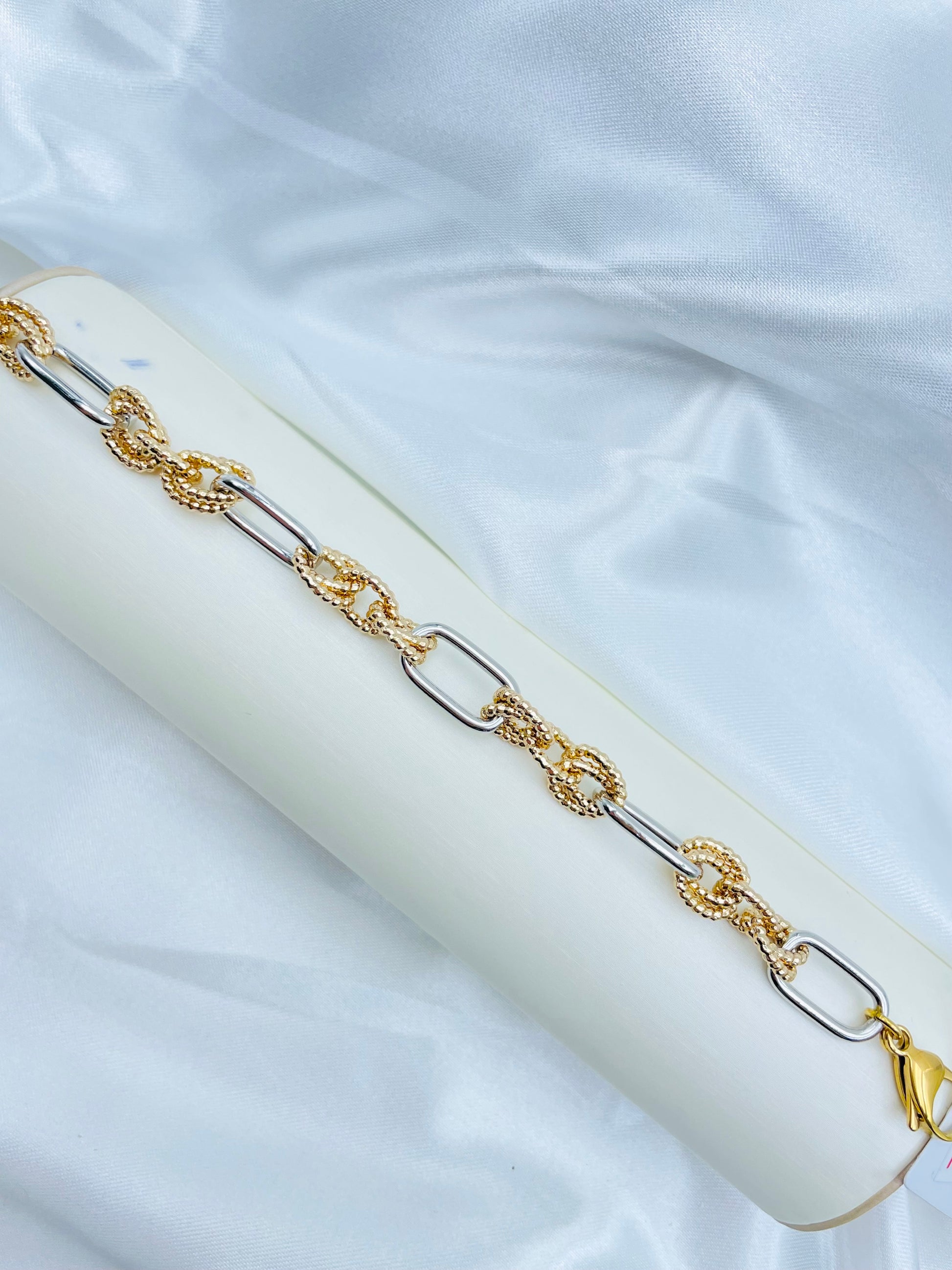 La pulsera Xuping es una pieza única y original con eslabones grandes en color plateado y nudos entrelazados en un elegante tono rosado. Ideal para lucir en cualquier ocasión, su diseño hermoso hará que destaques con estilo. ¡No te pierdas de esta joya de moda!