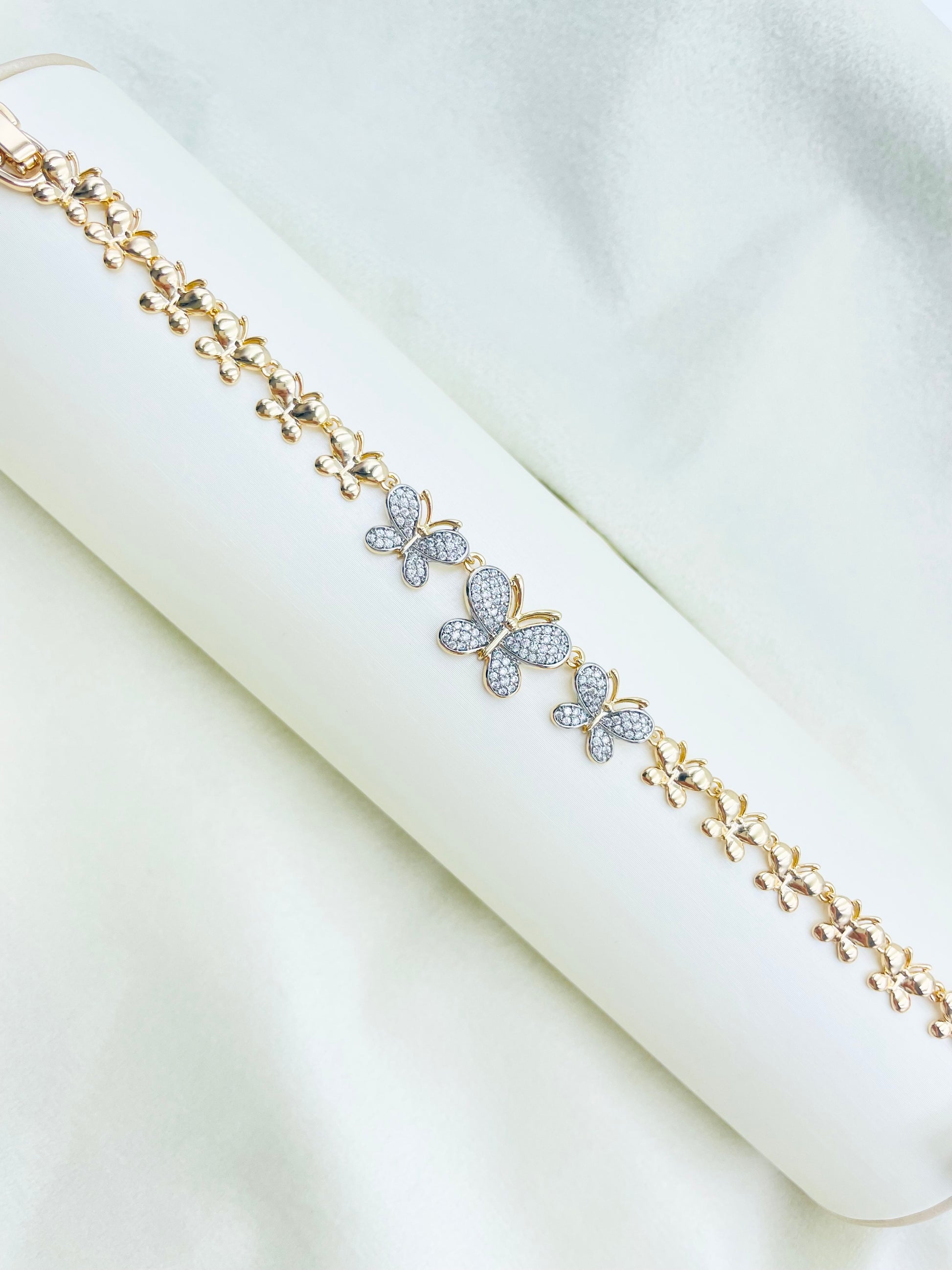 La pulsera Xuping es una elegante y delicada pieza con eslabones de mariposa y 3 mariposas centrales con brillos plateados. Añade un toque de brillo y sofisticación a cualquier atuendo. Hecha con materiales de calidad, esta pulsera es perfecta para cualquier ocasión.