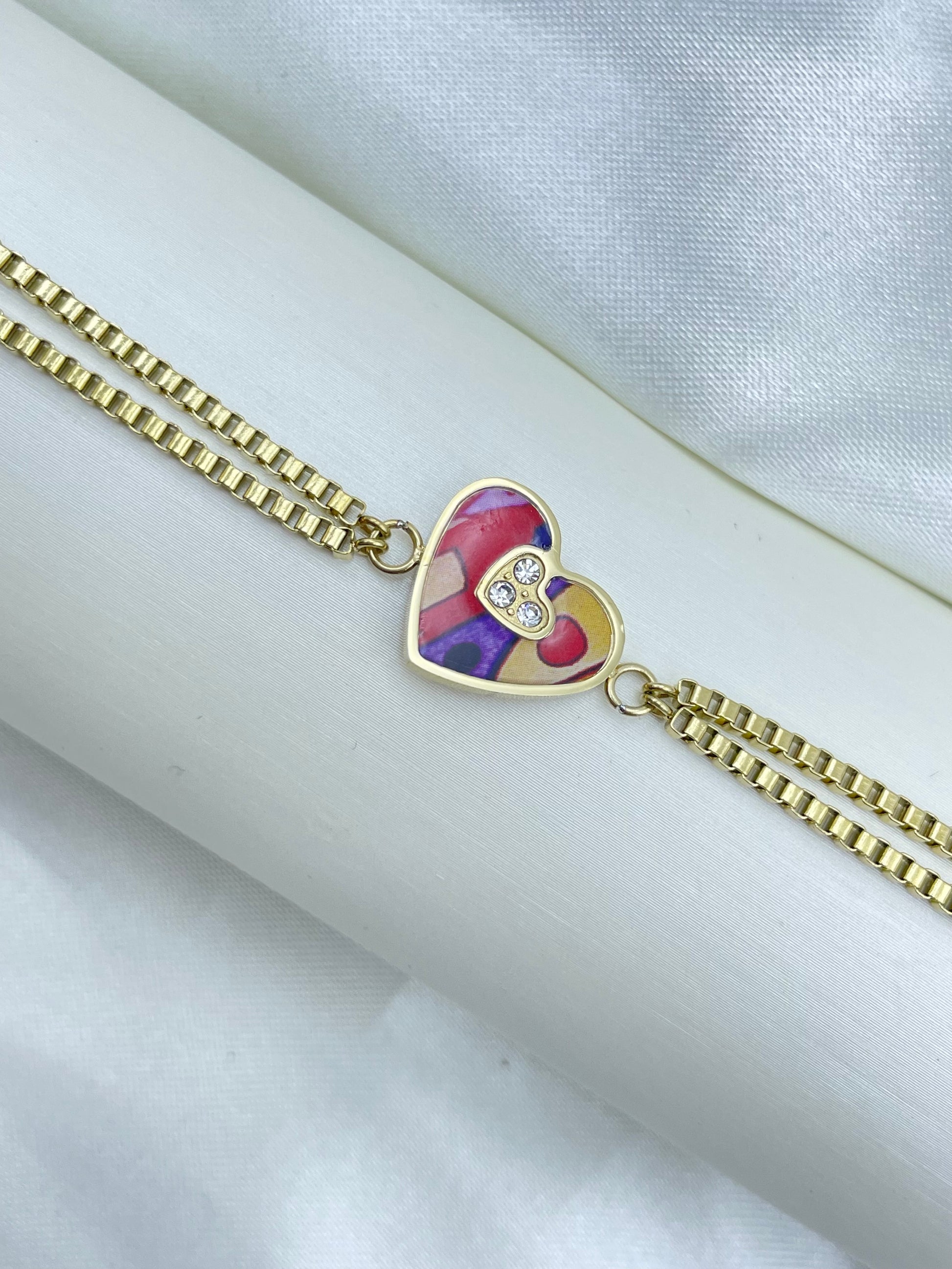 Esta pulsera de Xuping TTM es el accesorio perfecto para añadir un toque de color y estilo a tu atuendo. Con una doble cadena y un corazón colorido en el centro, esta pulsera es moderna y llamativa. ¡Haz una declaración de moda con esta pulsera única!