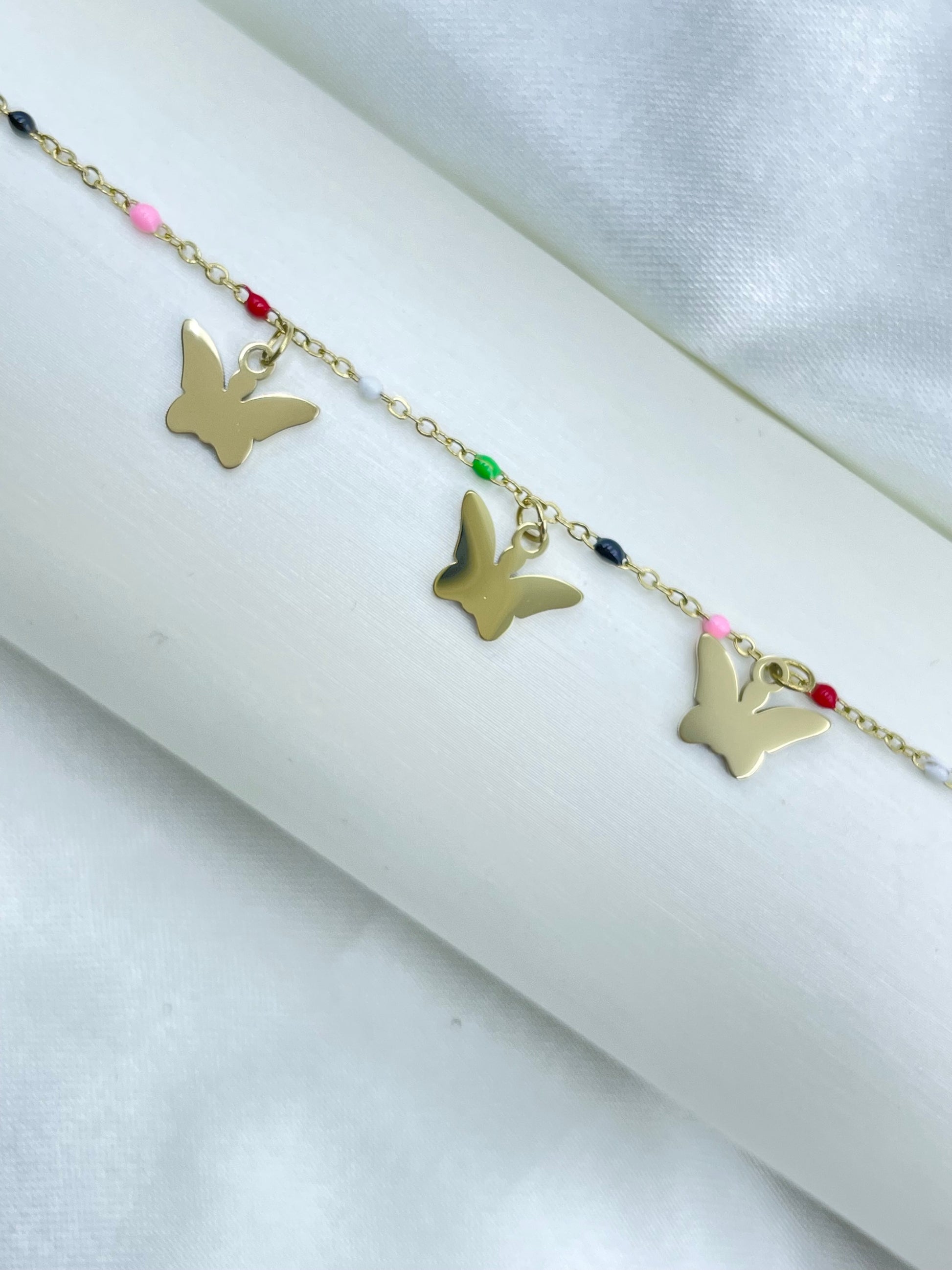Experimente la belleza de la naturaleza con la Pulsera Xuping TTM. Hecha con una cadena delgada y tres dijes de mariposas en el centro, esta pulsera encarna la elegancia y la delicadeza. Añada un toque de encanto a cualquier conjunto con este accesorio único.