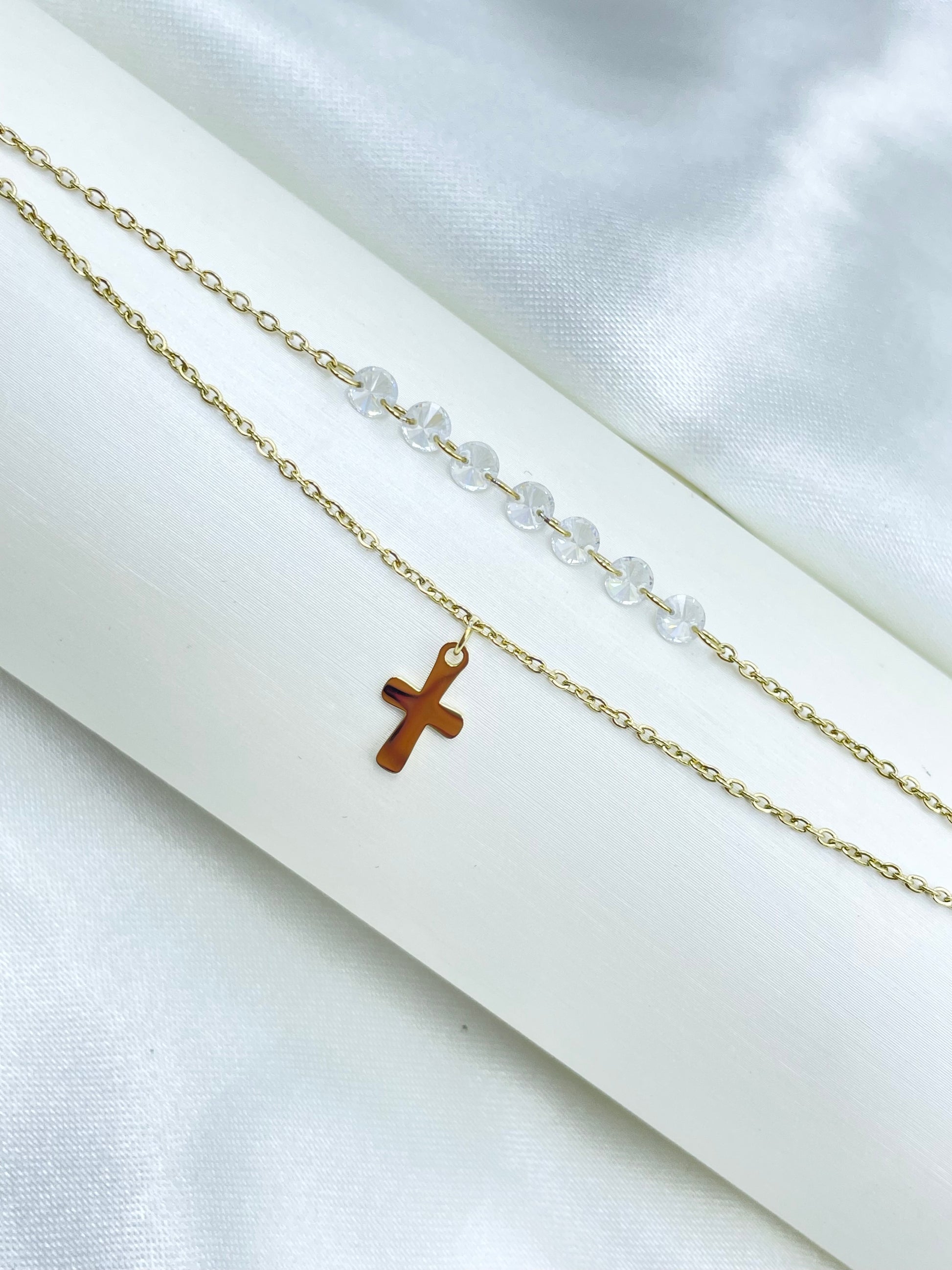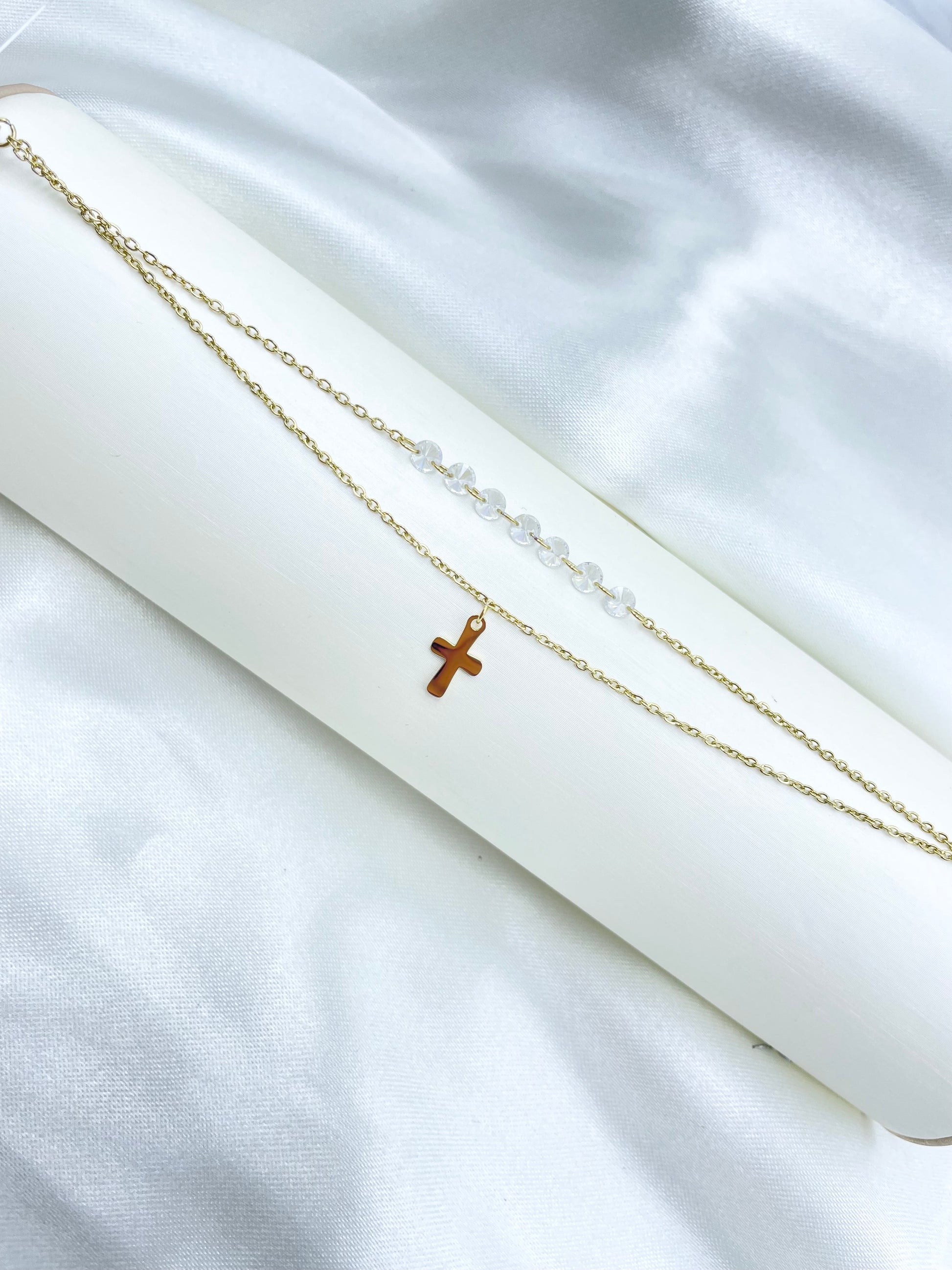 La Pulsera Xuping TTM es un accesorio elegante que combina una doble cadena con bolitas de cristal y un dije de cruz. El diseño sofisticado y los materiales de alta calidad la convierten en una excelente opción para darle un toque de estilo a tus outfits. Atrévete a lucirla y resaltar tu personalidad con esta hermosa pulsera.