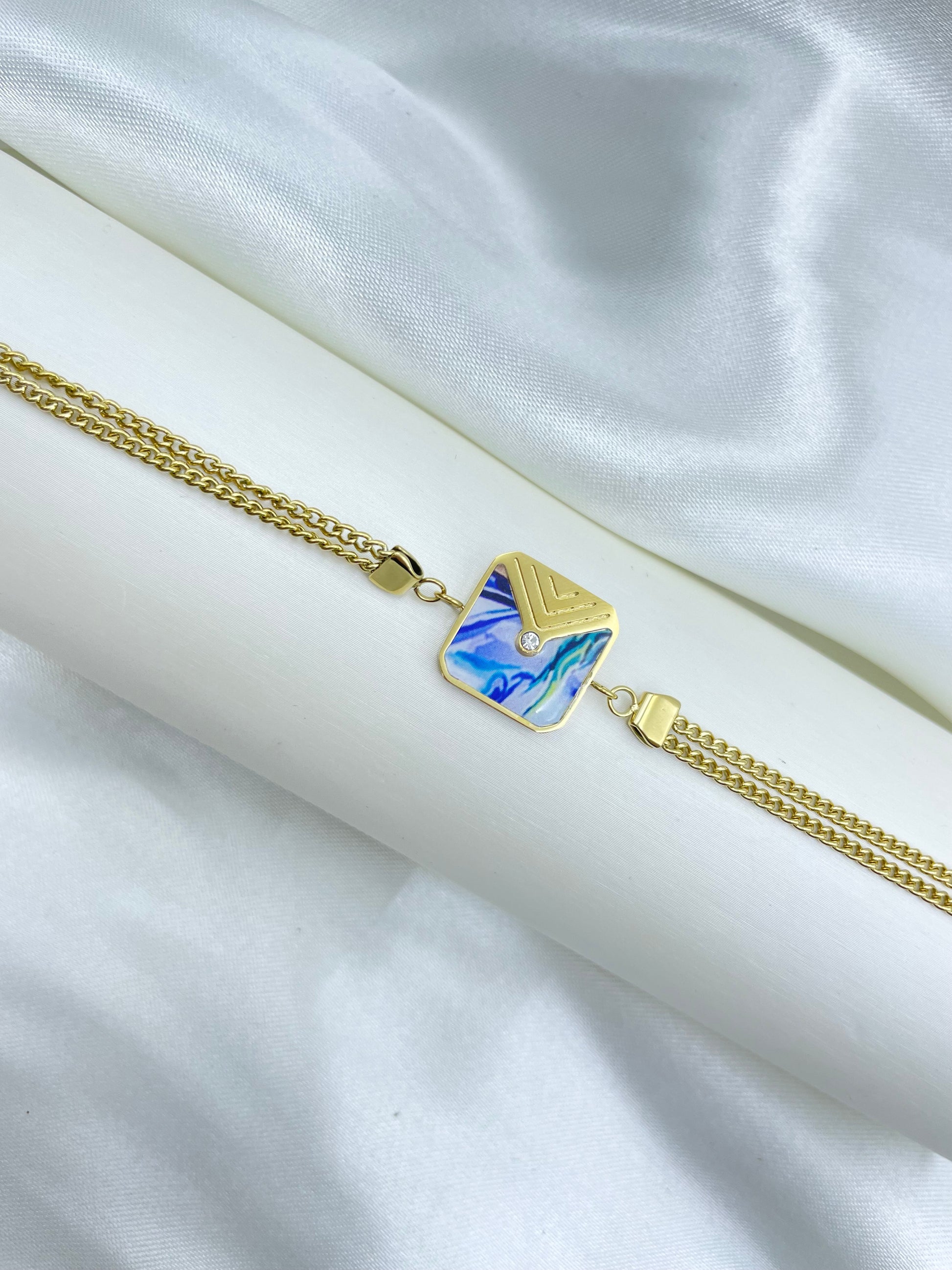 La Pulsera Xuping TTM está hecha de acero inoxidable y cuenta con un dije cuadrado en el centro con un hermoso color marmoleado en tonos azules. Esta pulsera es elegante y duradera, perfecta para cualquier ocasión especial. Combina estilo y calidad con la Pulsera Xuping TTM.