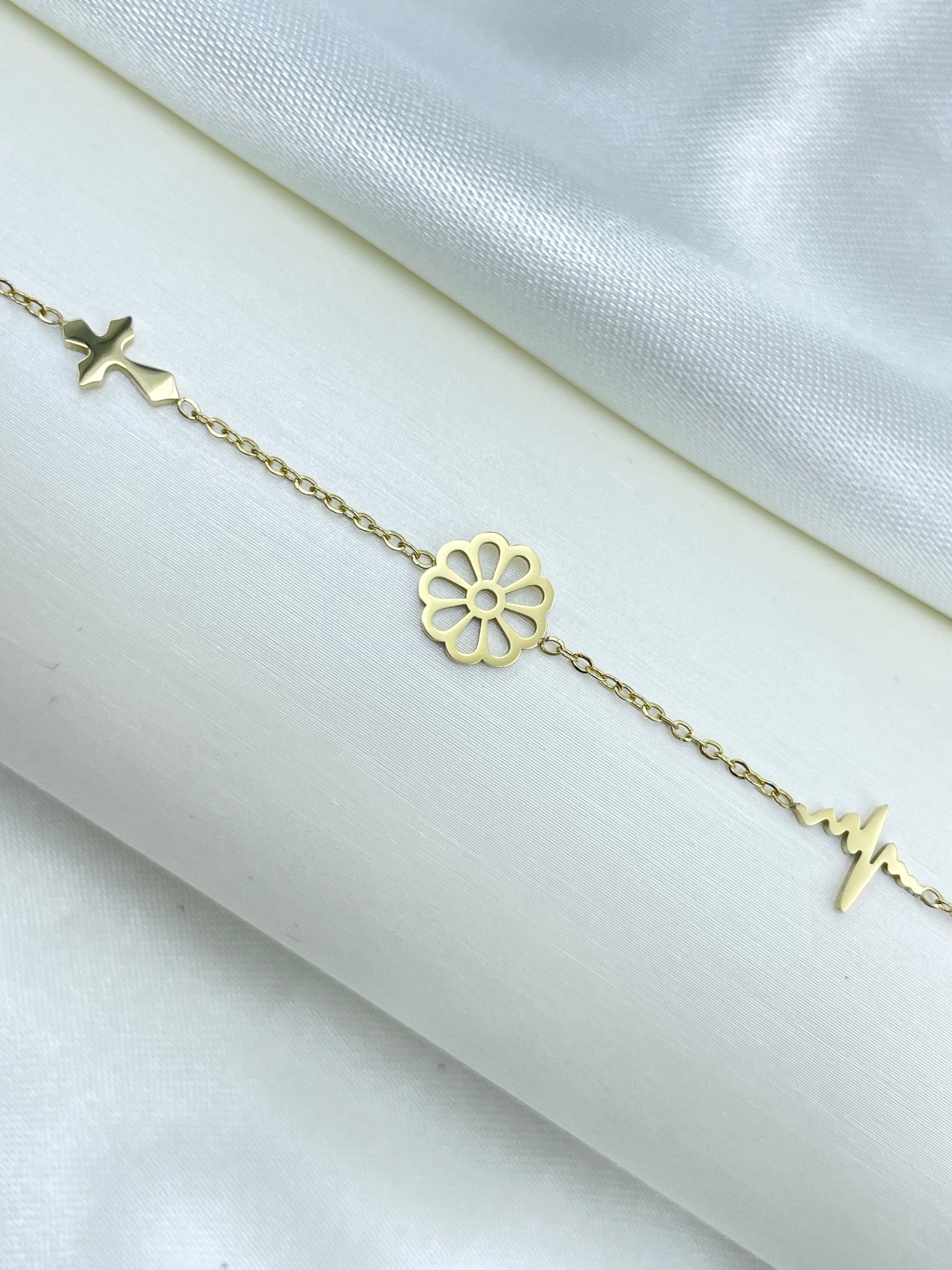Esta pulsera de la marca Xuping presenta dijes de la línea de la vida, cruz y flor que simbolizan la protección, la fe y la belleza. Fabricada con materiales de alta calidad, es una pieza elegante y significativa para cualquier ocasión.