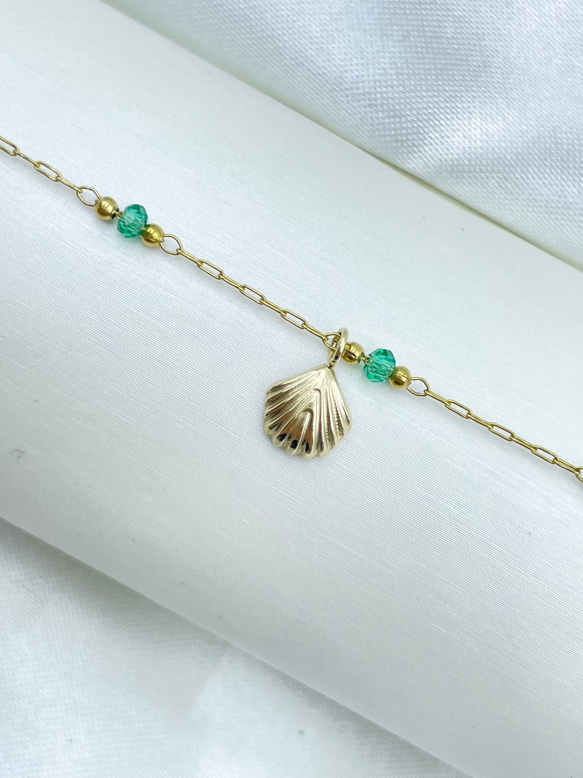 Esta pulsera Xuping TTM es la adición perfecta a tu look veraniego. La cadena delgada y elegante cuenta con piedras verdes que le dan un toque de color y un dije de concha de mar que te conecta con la naturaleza. Hecha con materiales de alta calidad, es duradera y te hará lucir hermosa.