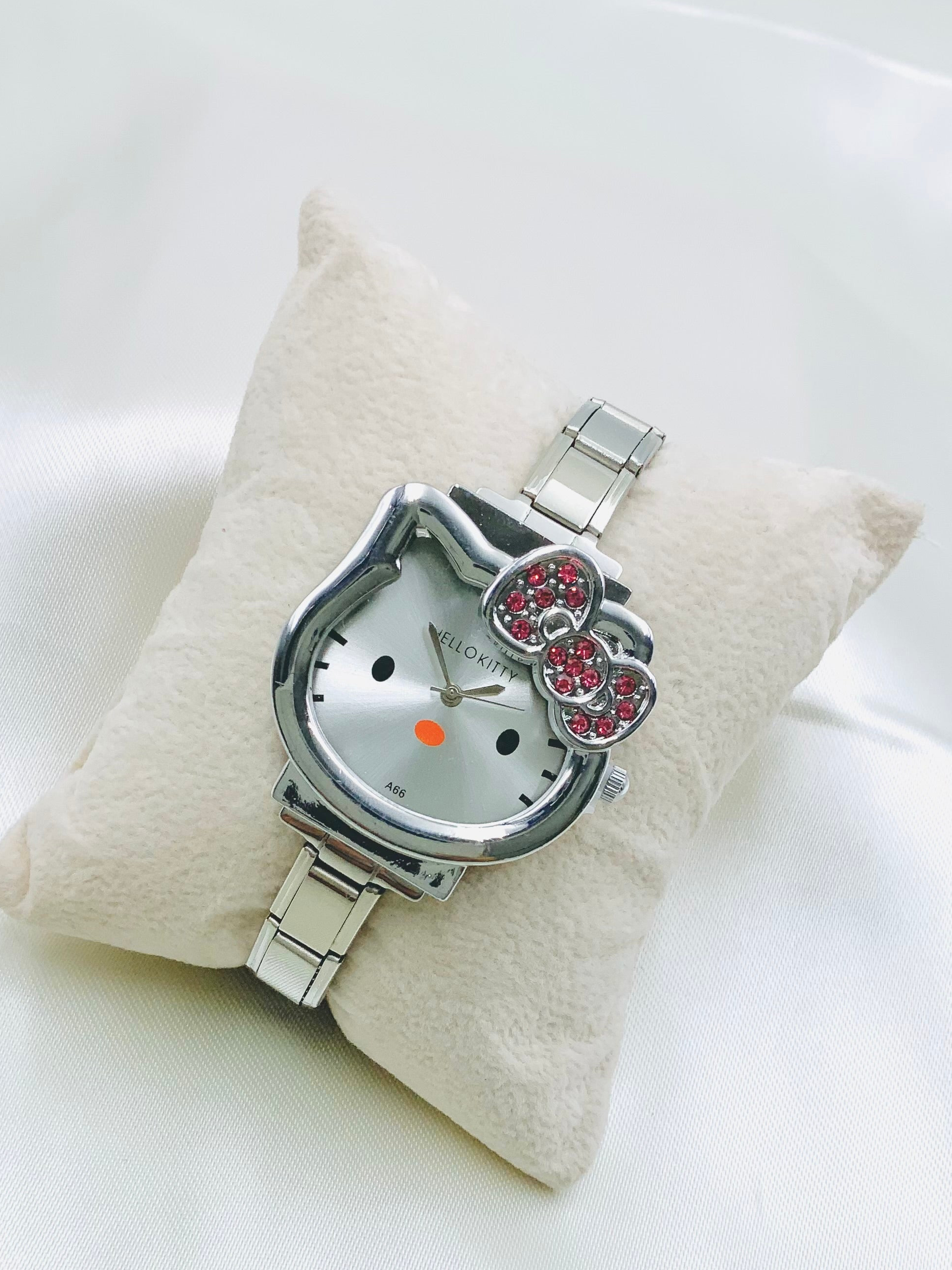 El Reloj Italiano cuenta con un elegante brazalete italiano y detalles de Hello Kitty en un hermoso tono plateado. Lo último en estilo y sofisticación que complementará cualquier atuendo. Haz una declaración de moda con este reloj de alta calidad.