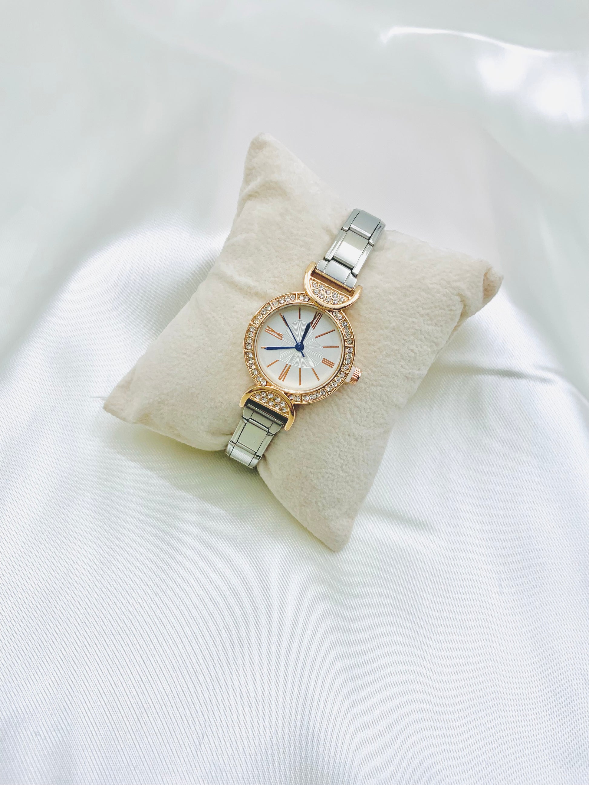 Un accesorio sofisticado y de moda, este reloj de brazalete italiano plateado combina funcionalidad y estilo. Con su elegante diseño, este reloj rosa con brillos será un complemento perfecto para cualquier atuendo. Con la calidad y precisión de un reloj italiano, estarás a la moda y siempre a tiempo.