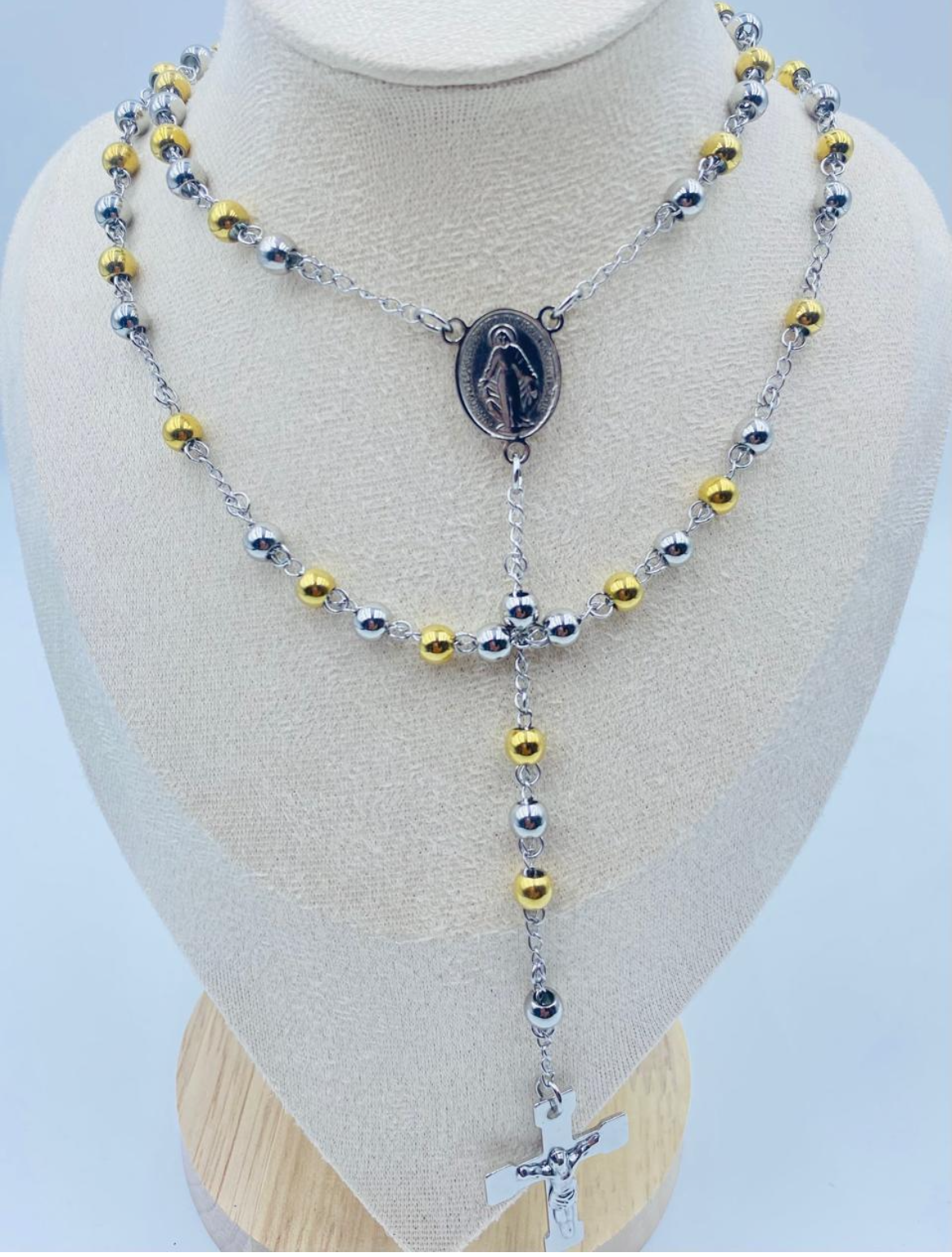 Rosario de plata con detalles dorados. Hecho a mano con materiales de alta calidad. Perfecto para llevar en ocasiones especiales y como un recordatorio de la fe católica. Un accesorio elegante y significativo para tu vida diaria.